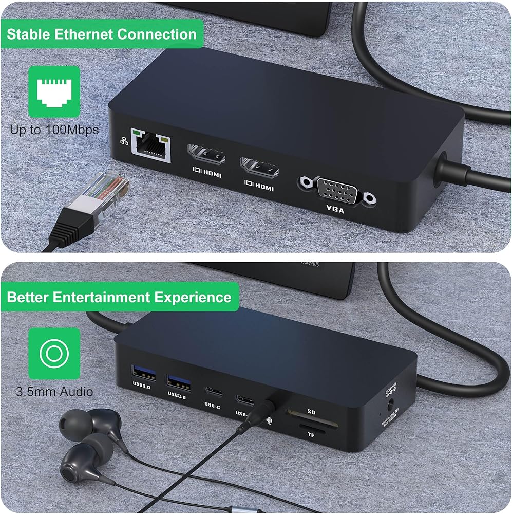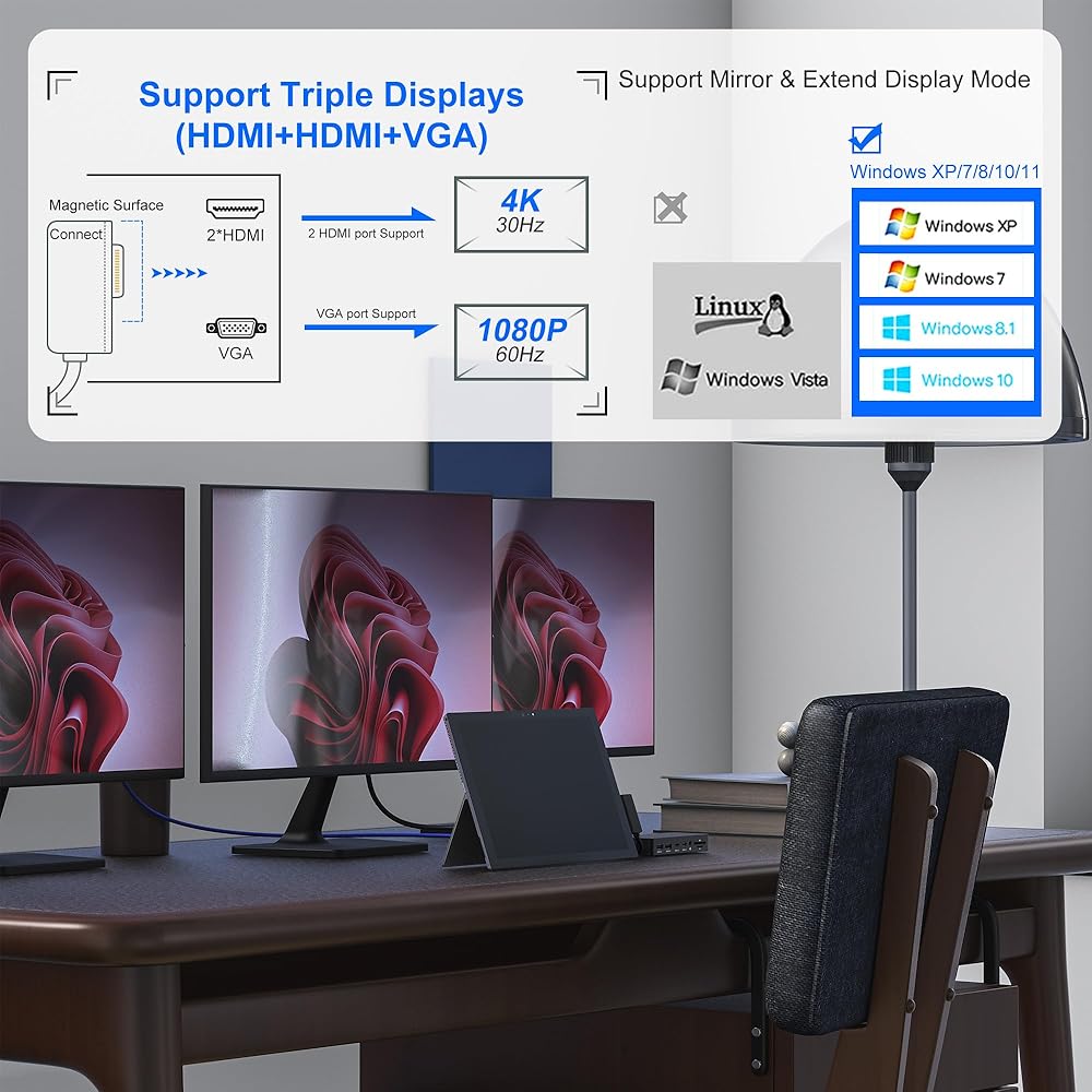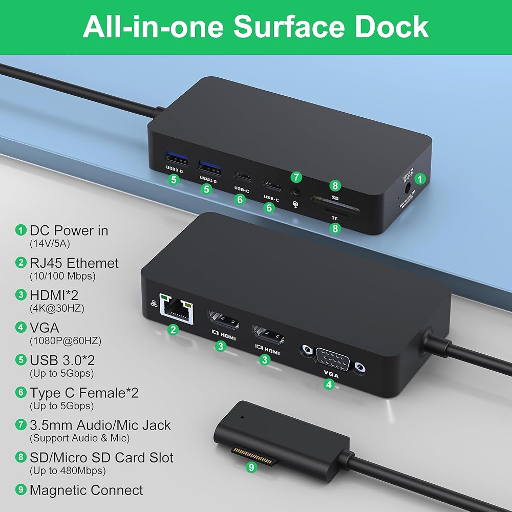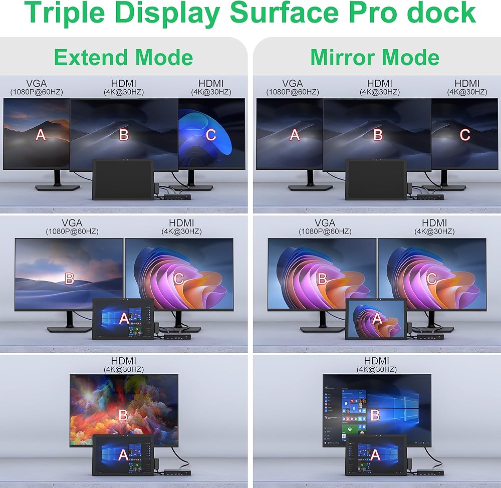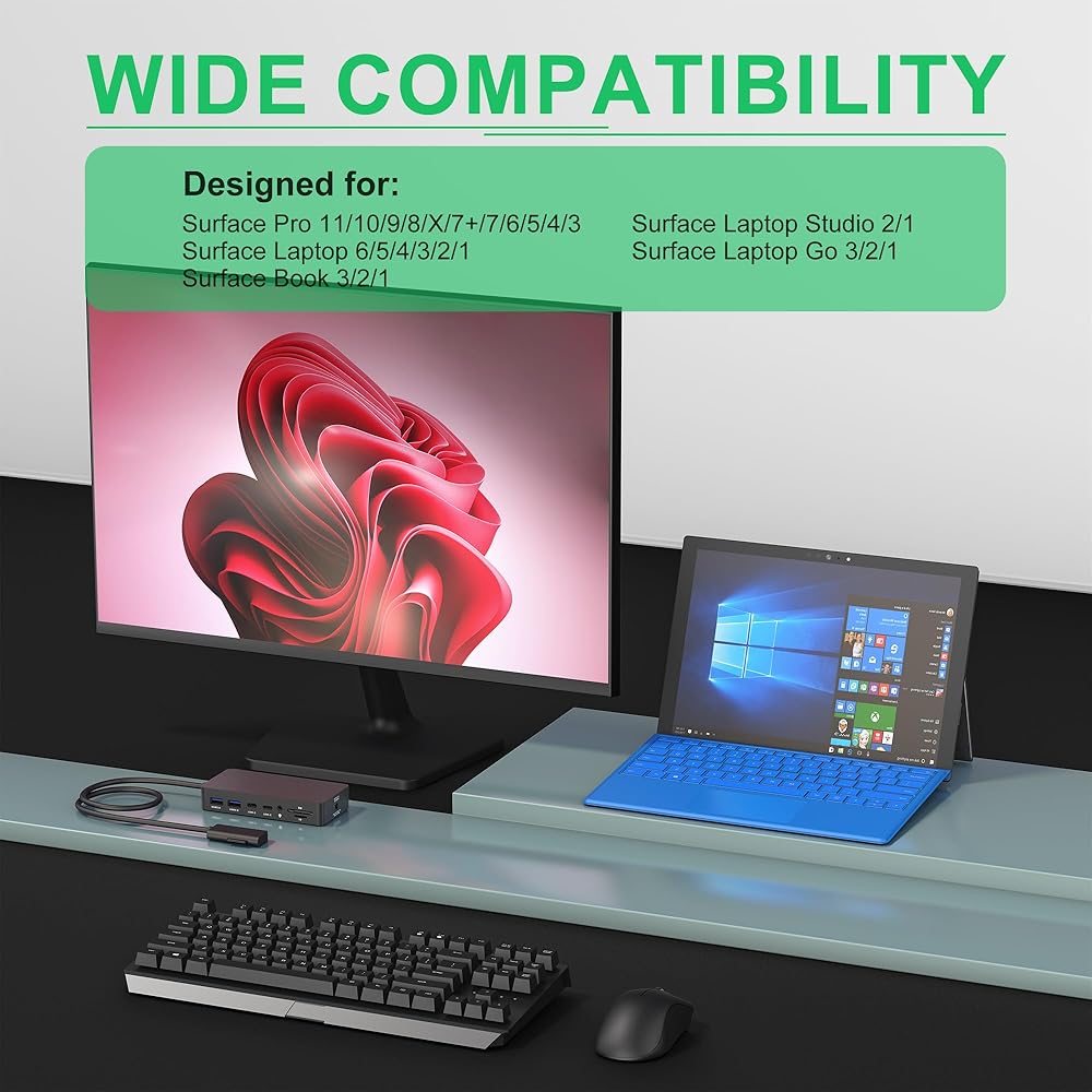 قاعدة شحن Microsoft Surface، شاشات عرض ثلاثية 2 HDMI+VGA، قاعدة سطحية 12 في 1 لجهاز Microsoft Surface Pro 11/10/9/8/X/7/6/5/4/3، وSurface Laptop 6/5/4/3 /2/1، سيرفس لاب توب جو 3/2/1، سيرفس بوك