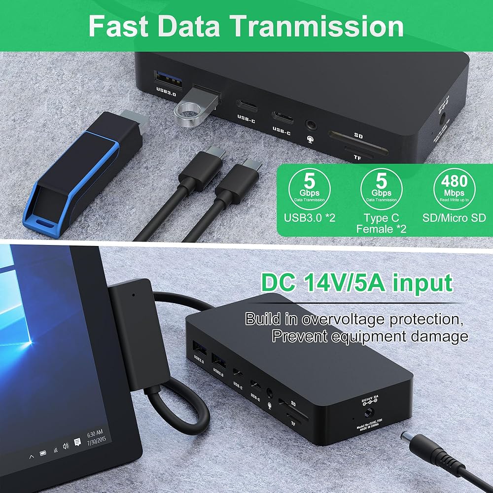 • محطة إرساء سطحية لنقل البيانات الإنتاجية: توفر واجهتين USB A 3.0، كما أن قاعدة Surface pro 9 الخاصة بنا مجهزة بمنفذين USB-C 3.1، خاصة للبيانات، ومعدل نقل عالٍ 5 جيجابت في الثانية مثل منافذ USB 3.0، كما أن قاعدة Surface pro إضافية أيضًا قارئ بطاقات TF&SD، يمكنه قراءة ملفاتك الكبيرة وصورك المخزنة ونسخها احتياطيًا بسرعة وكفاءة