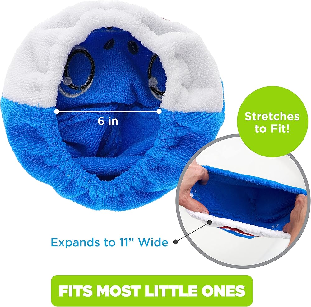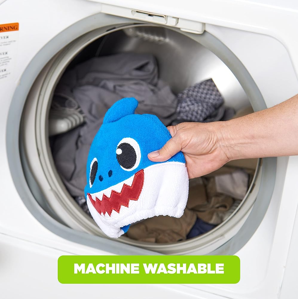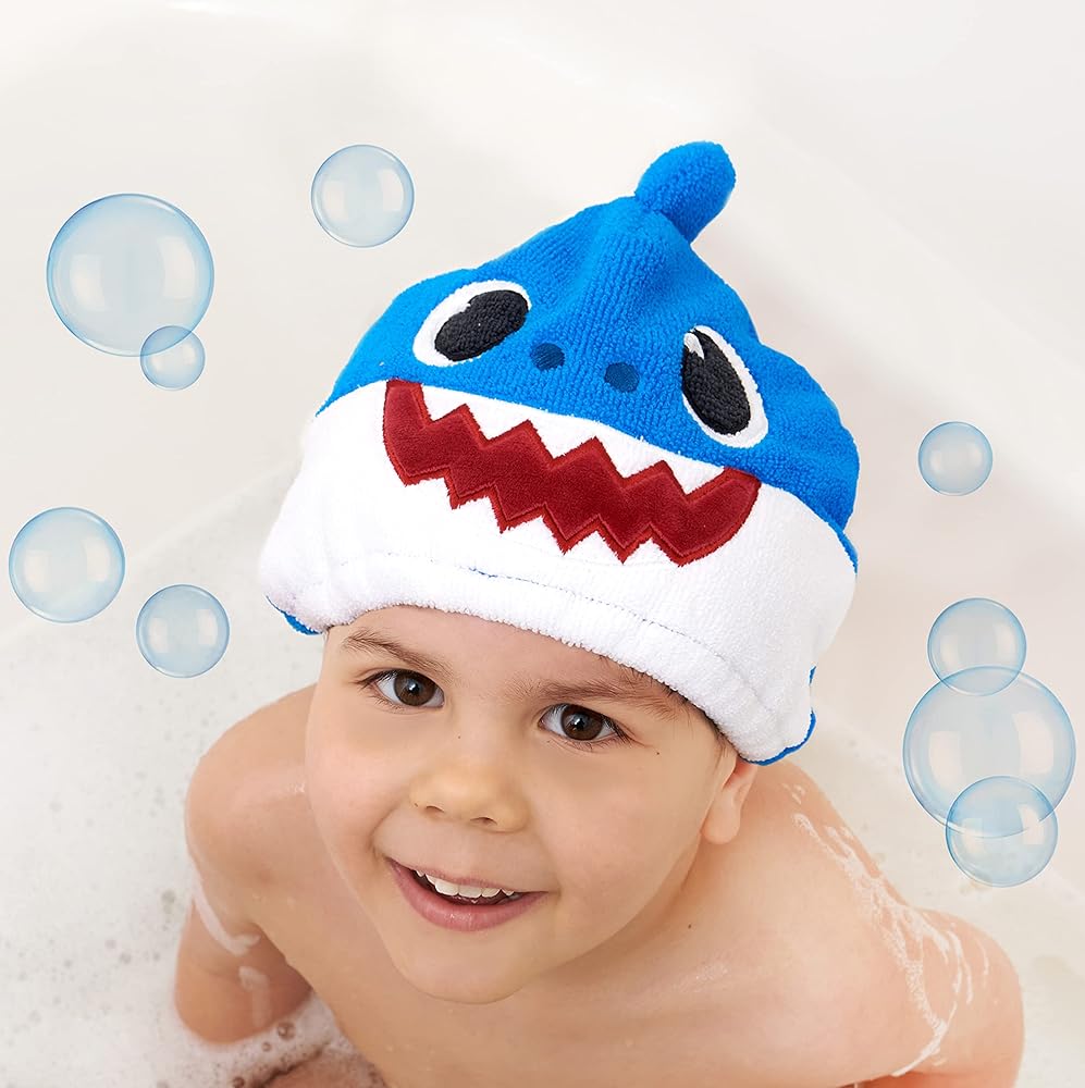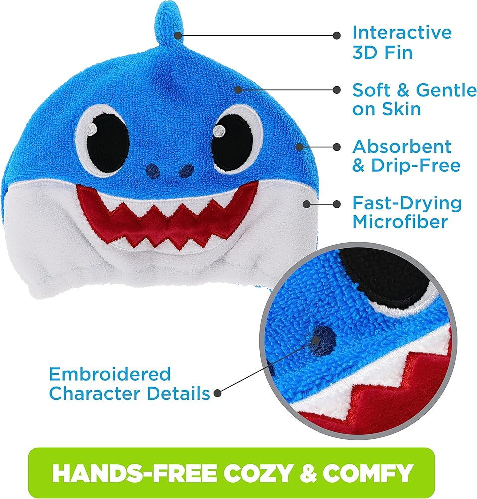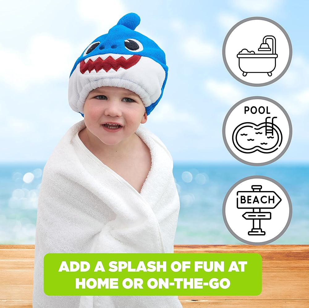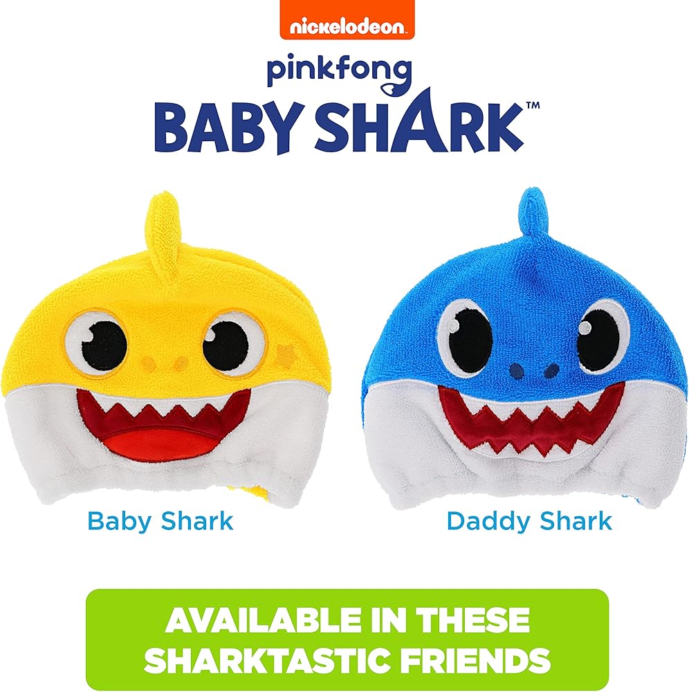 MAKES BATH TIME FUN: Daddy Shark Towel Cap Pal from Baby Shark combines a smiling, fun character design with incredibly functional fabric that dries hair quickly
