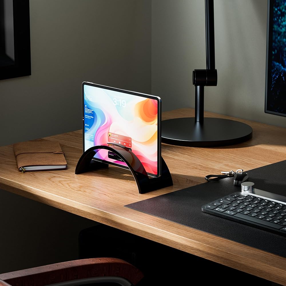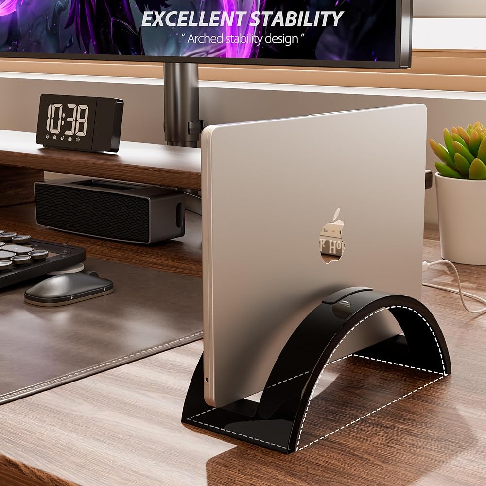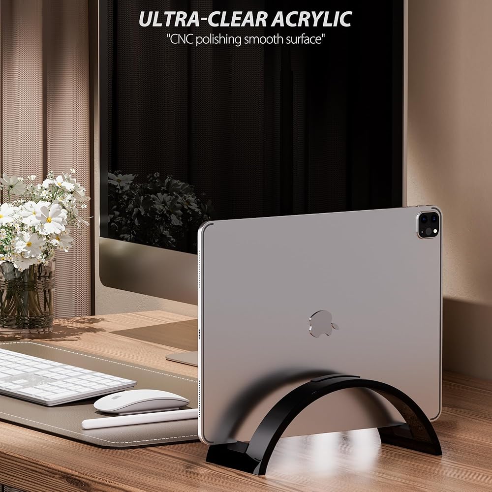 【تصميم بسيط وحرفية أكريليك】: الحامل العمودي للكمبيوتر المحمول MaybeRain مصنوع من مادة أكريليك شفافة وعالية الجودة ويتميز بتصميم أنيق وبسيط وعملي وموفر للمساحة، مع إضافة مظهر وشعور فريد إلى إعداد المكتب.