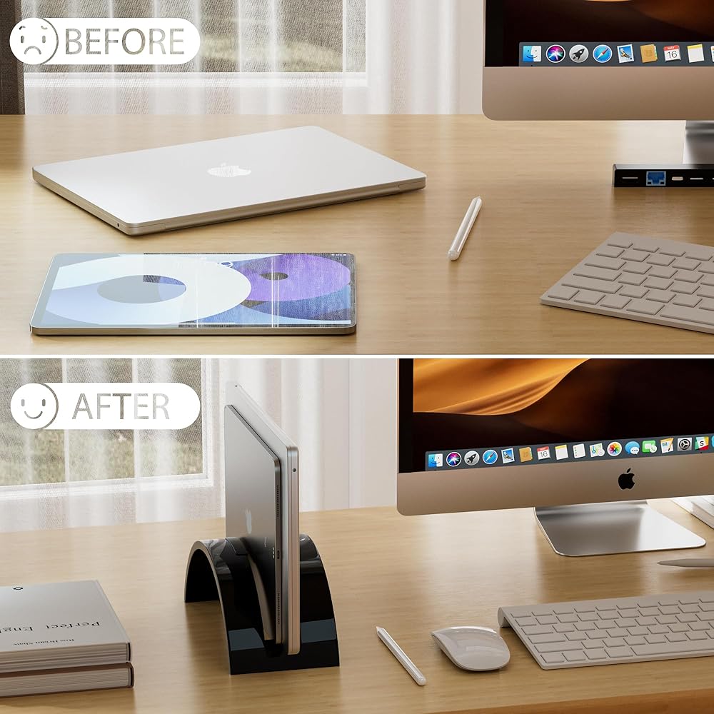 【تخزين سطح المكتب وتوفير المساحة】: على عكس الحوامل الأفقية، يوفر حامل الكمبيوتر المحمول MaybeRain عموديًا مساحة سطح المكتب بشكل فعال، مما يعزز مساحة عمل مرتبة ويزيد من الاستخدام.