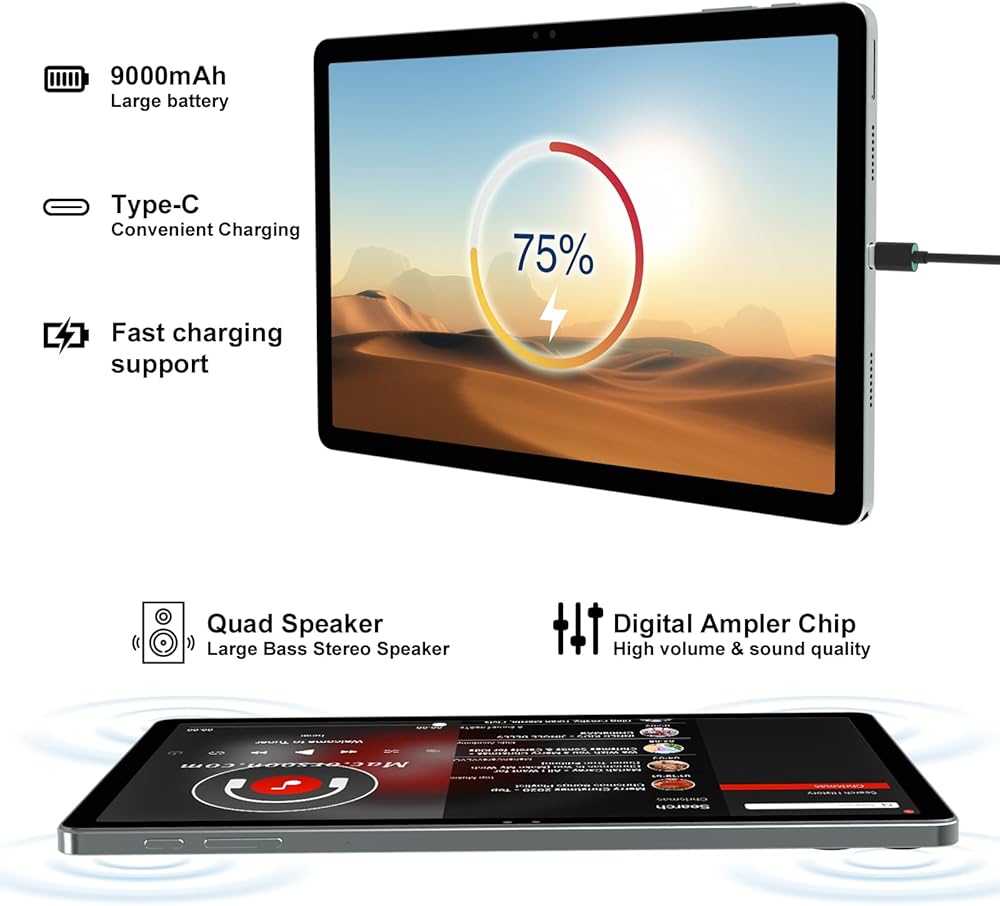 عمر بطارية ممتد: مزود ببطارية صديقة للبيئة بقدرة 9000 مللي أمبير في الساعة، يوفر هذا الجهاز اللوحي مقاس 11 بوصة عمر بطارية طويل. استمتع بما يصل إلى 8 ساعات من الاستخدام المتواصل، سواء كان ذلك في الألعاب أو الموسيقى أو مقاطع الفيديو أو الكتب الإلكترونية