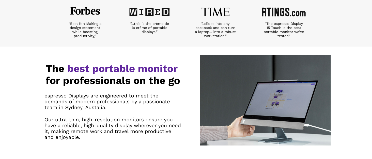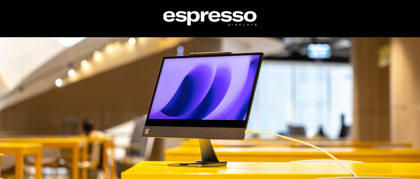 تعرض شركة Espresso شاشة محمولة تعمل باللمس مقاس 15 بوصة مع حامل قابل للتعديل | شاشة رفيعة للغاية، بدقة 1080 بكسل عالية الدقة، ومنفذ USB-C، وشاشة تعمل باللمس لأجهزة الكمبيوتر المحمول، وأجهزة Mac، والكمبيوتر الشخصي، والألعاب، والسفر