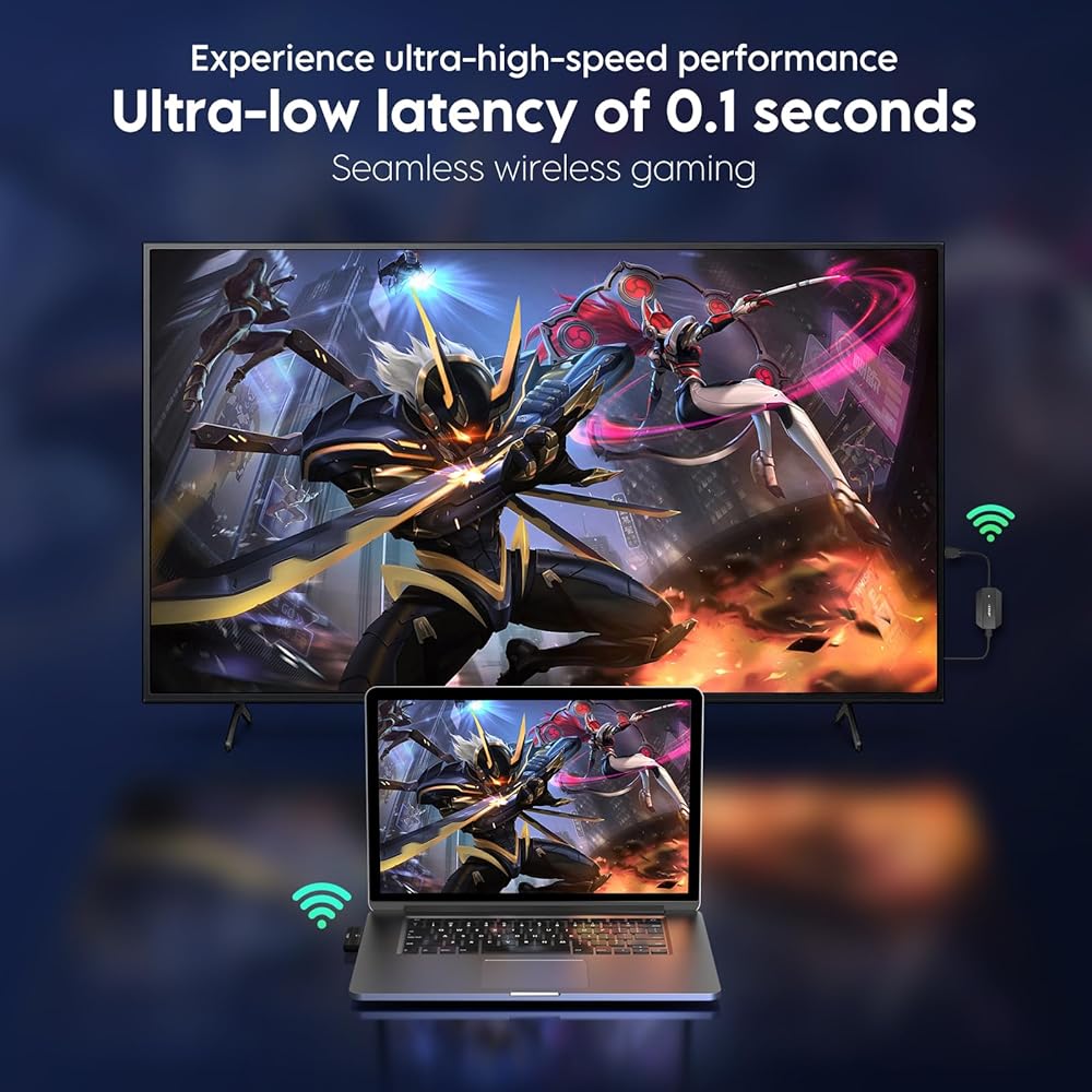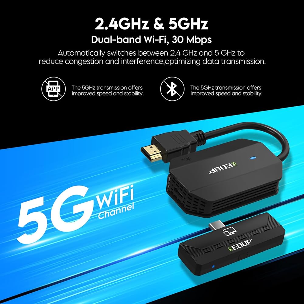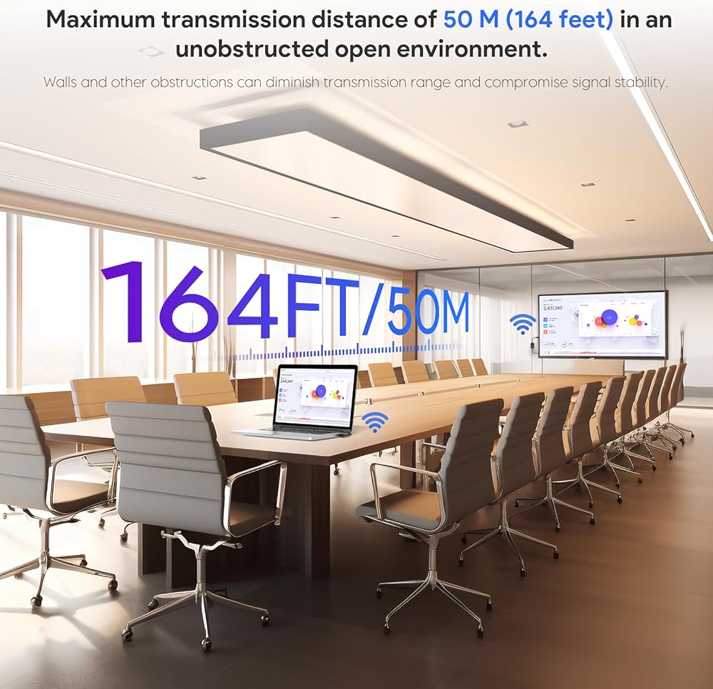 نقل لاسلكي لمسافات طويلة بطول 164 قدمًا: يدعم تقنية النطاق المزدوج 2.4G/5G مع نطاق نقل يصل إلى 164 قدمًا (50 مترًا) دون عائق. يقوم تلقائيًا بتحديد الوضع الأمثل بناءً على البيئة والأجهزة.