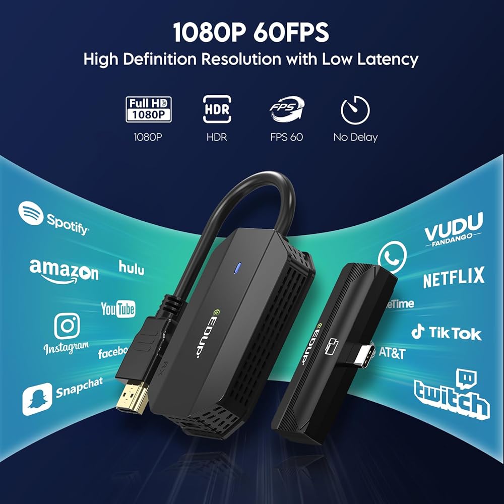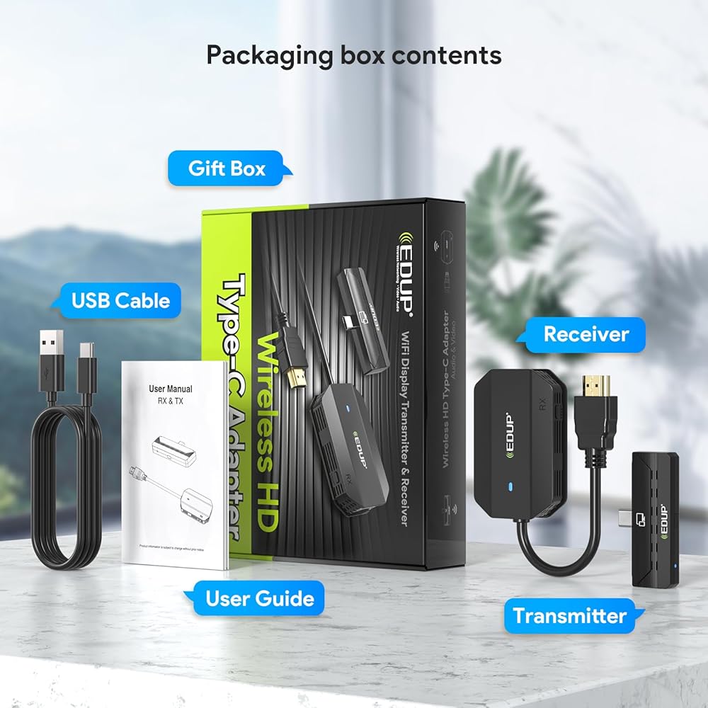 التوصيل والتشغيل: ما عليك سوى توصيل جهاز الإرسال (TX) بمنفذ USB-C للهاتف/الكمبيوتر/الكمبيوتر المحمول وجهاز الاستقبال (RX) بمنفذ HDMI لجهاز HDTV/جهاز العرض/الشاشة. ليست هناك حاجة إلى برنامج تشغيل ويتم الاقتران تلقائيًا، مما يوفر تجربة توصيل وتشغيل حقيقية بدون كابلات HDMI.