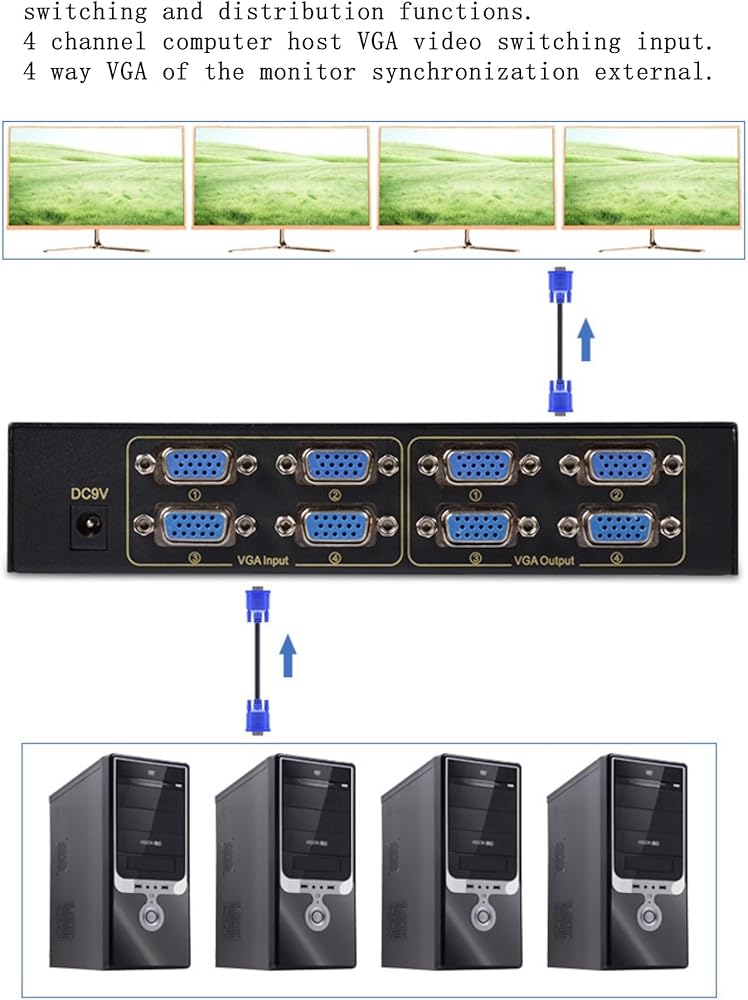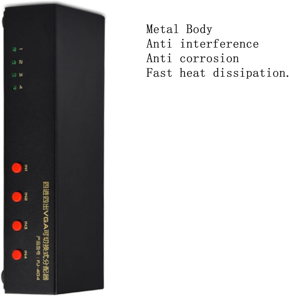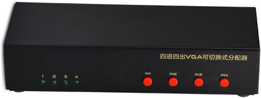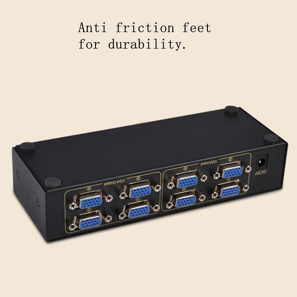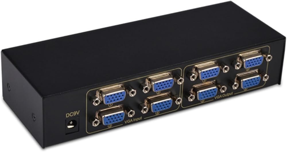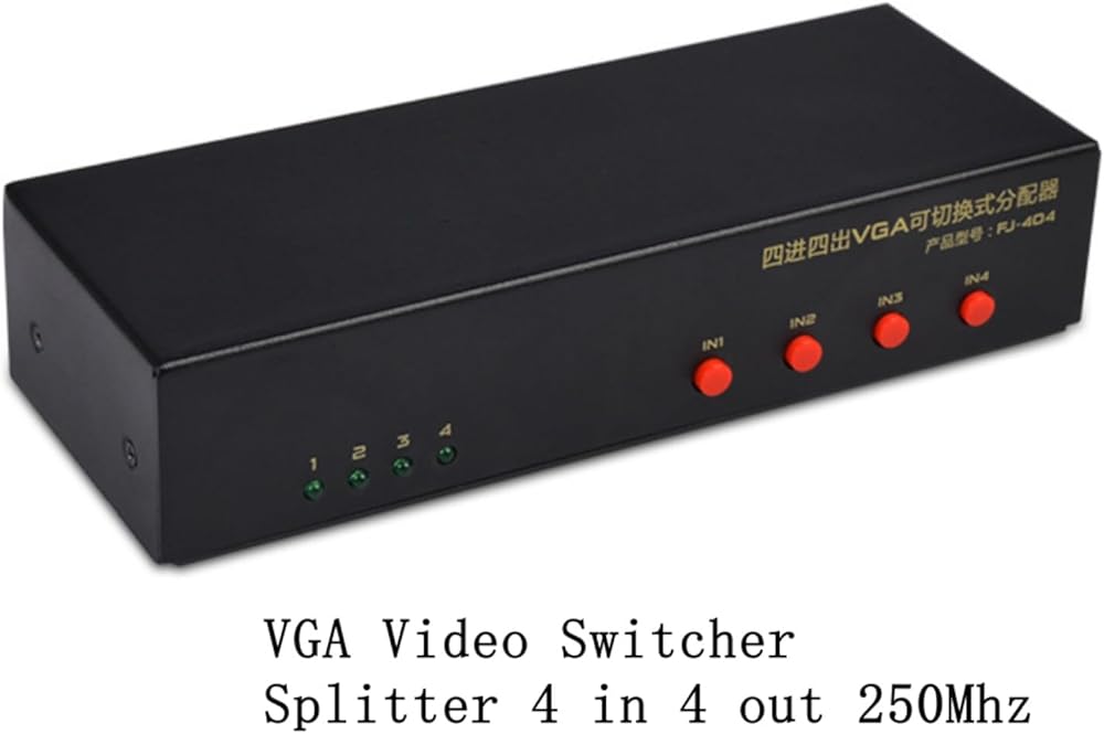 Brand Suckoo VGA Video Switch Splitter 4 In 4 Out 4 In 2 Out Bidirectional Interconvertible HD Video Sharer 250Mhz Computer Host External 4 Port VGA TV Monitor Projector Selector Switch Box 1080P Black. This VGA video switch distributor 4 in 4 out is a very practical device, it has a 4 in 4 out interface, you can access the VGA signal source in the 4-port VGA input switcher, such as computer host DVD player external 4 monitors TV projector and other equipment. It displays 4 identical images of the same picture. In addition, it also has 4 inputs and 4 outputs, which can be connected to 4 external display devices at the same time. The switcher distributor supports the VGA standard and is capable of transmitting high-quality video signals with a resolution of 1920x1440 pixels. This means that you can enjoy clear, detailed images and video effects. Switching mode: Manual button switching. The switcher 4 in 4 out also has a power supply function, which can provide stable power for the connected devices to ensure the stability and reliability of signal transmission. Color: black, product size: 17.8x6.5x3.7 cm. Accessories: 1pc of this product + 1pc of DC adapter for free (This product does not support VGA video matrix function). This VGA video switcher distributor is a powerful and high-performance device for home entertainment systems, conference rooms, showrooms and many other occasions, allowing you to conveniently connect up to 4 display devices to enjoy a high definition video experience.