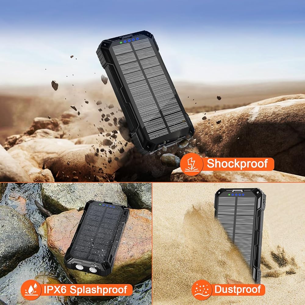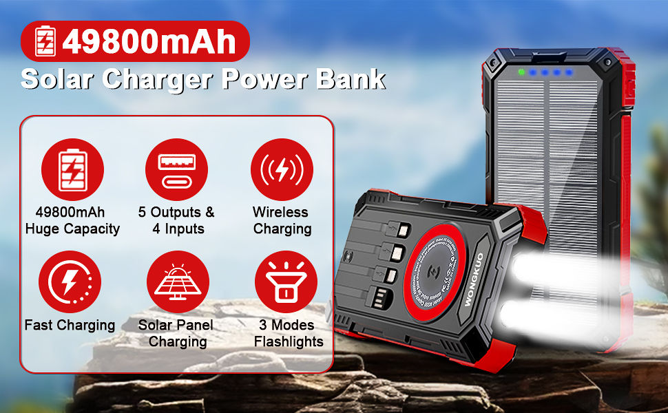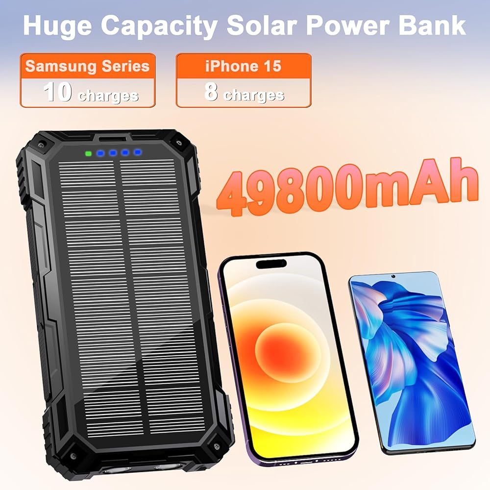 🔋【سعة كبيرة تبلغ 49800 مللي أمبير في الساعة】يتميز بنك الطاقة الشمسي هذا ببطارية ليثيوم بوليمر ممتازة تبلغ 49800 مللي أمبير في الساعة، ويمكنه شحن أجهزتك عدة مرات. يمكنك إعادة شحنه عبر محول أو لوحة شمسية، مما يزيل المخاوف بشأن نفاد الطاقة.