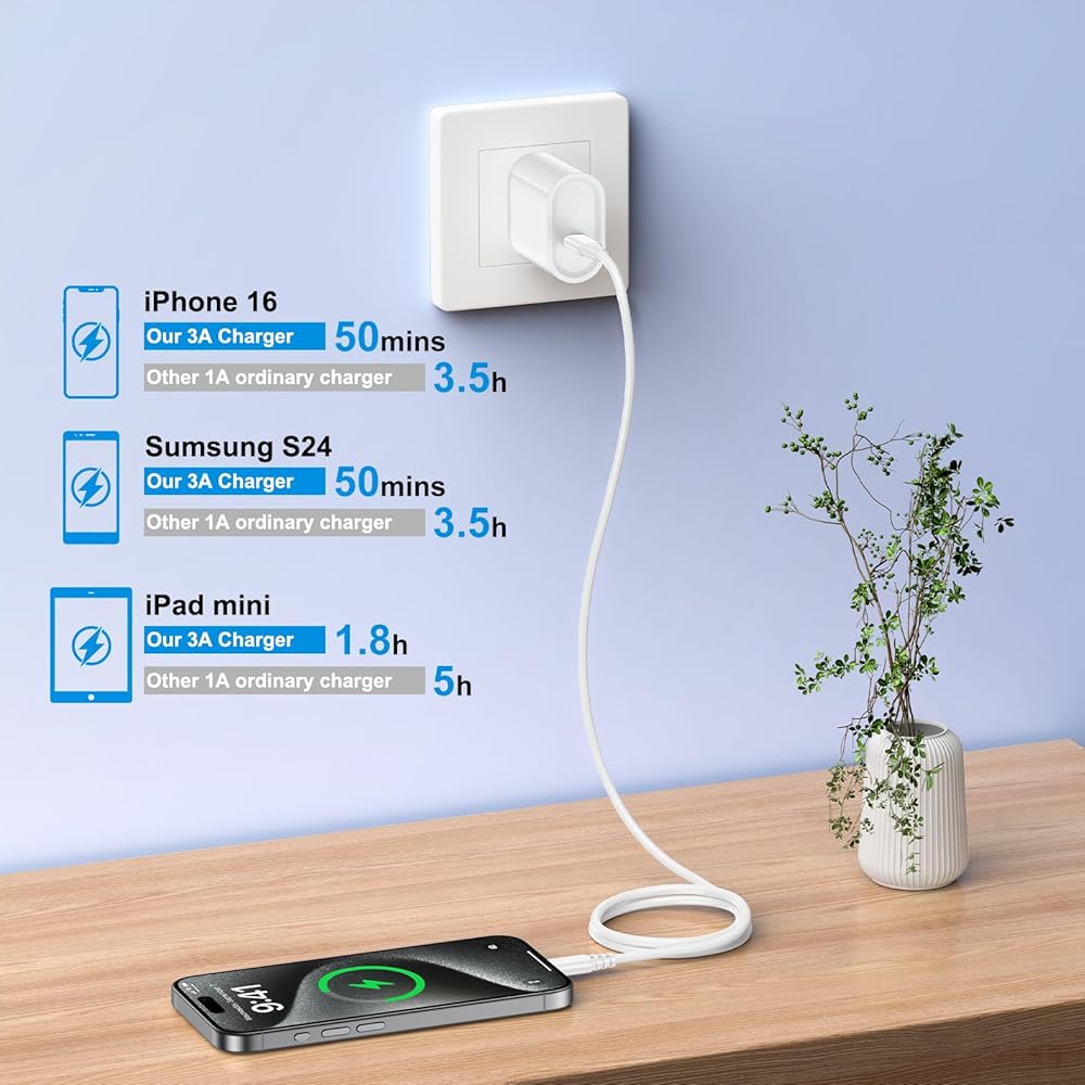 20w usb c block fast charging provides you max 20W output power, charging iPhone 16/16 Pro/16Pro Max/16 Plus up to 50% in just 30 minutes, full charging in only 60mins.
