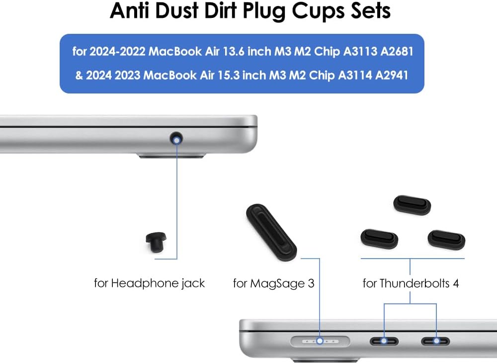 More protective for your MacBook: every anti-dust plug is specially molded, manufactured to the quality available. Flexible, easy to apply and remove for cleaning or disinfecting. Prevent your laptop from splashing liquid, dust, and other contaminants affecting the ports of laptop