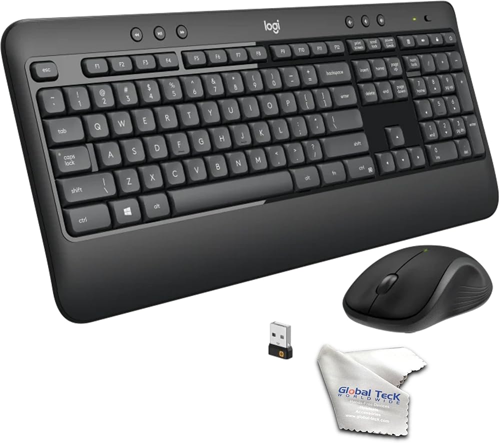مجموعة Global Teck المكونة من 4 عناصر: مجموعة لوحة مفاتيح وماوس لاسلكية متقدمة من Logitech MK540 - لوحة مفاتيح لاسلكية LogiTech لأجهزة الكمبيوتر المحمول K540 - M-R0050، ماوس LogiTech اللاسلكي لأجهزة الكمبيوتر المحمول M310 - Y-R0012، جهاز استقبال موحد USB Logitech - C-U0007 وGlobal Teck Microfiber قطعة قماش