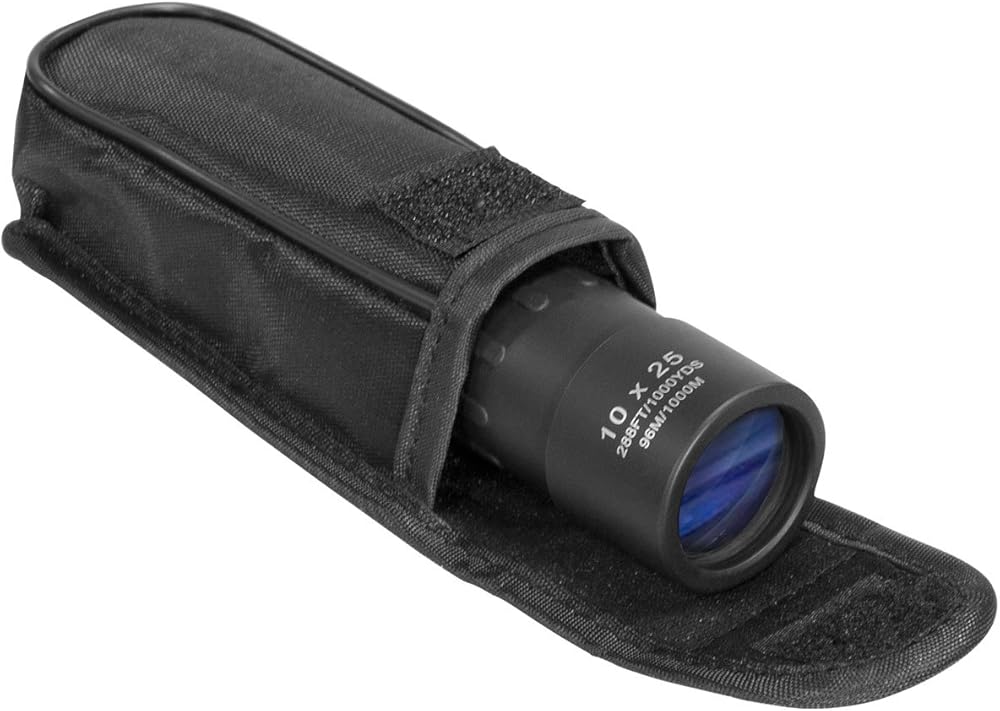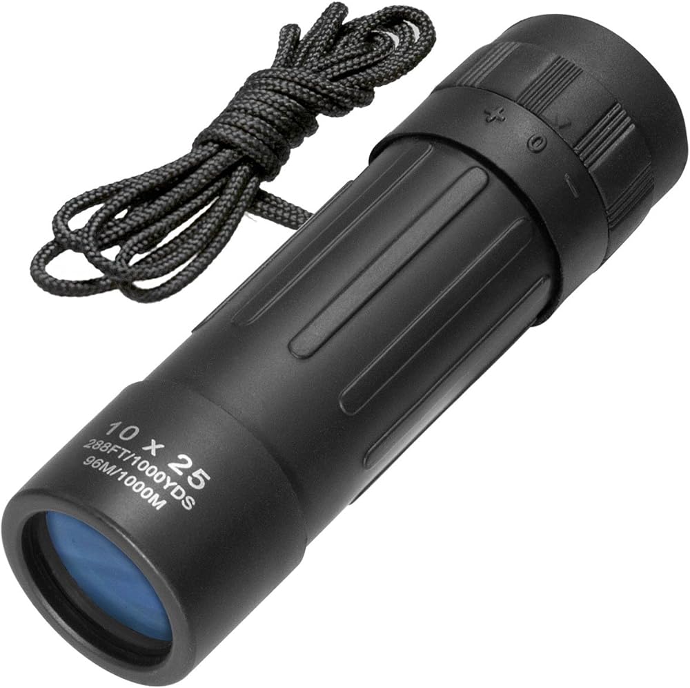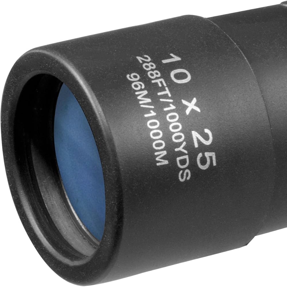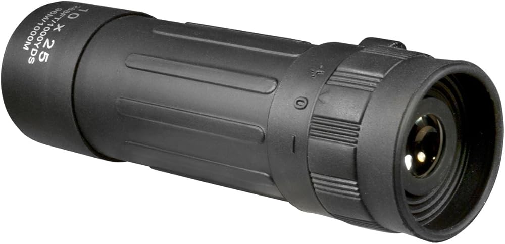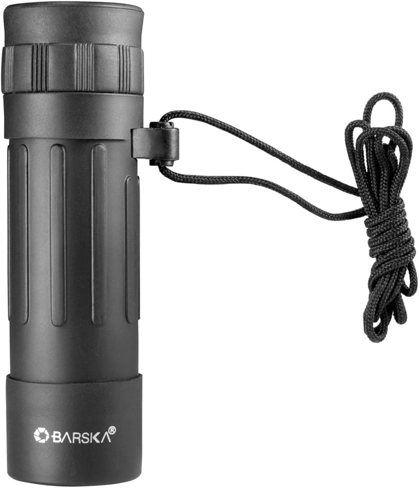 Barska 10x25 Lucid View Monocular (Black) Specifications: - 10. 0x Magnification, 25mm Objective - BK-7 Roof Prisms - Fully Coated Optics - Rubber Armored Housing - Grooved Eyepiece Focus Dial - Compact Lightweight Design - Included Wrist Strap - Black Finish