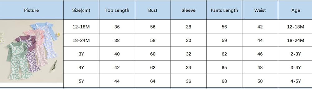 12-18M Tops Length: 36 Bust: 56 Sleeve: 28 Pants Length: 56 Waist: 42 Advised Age: 12-18 Months