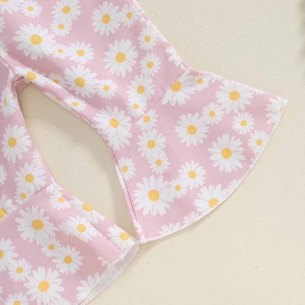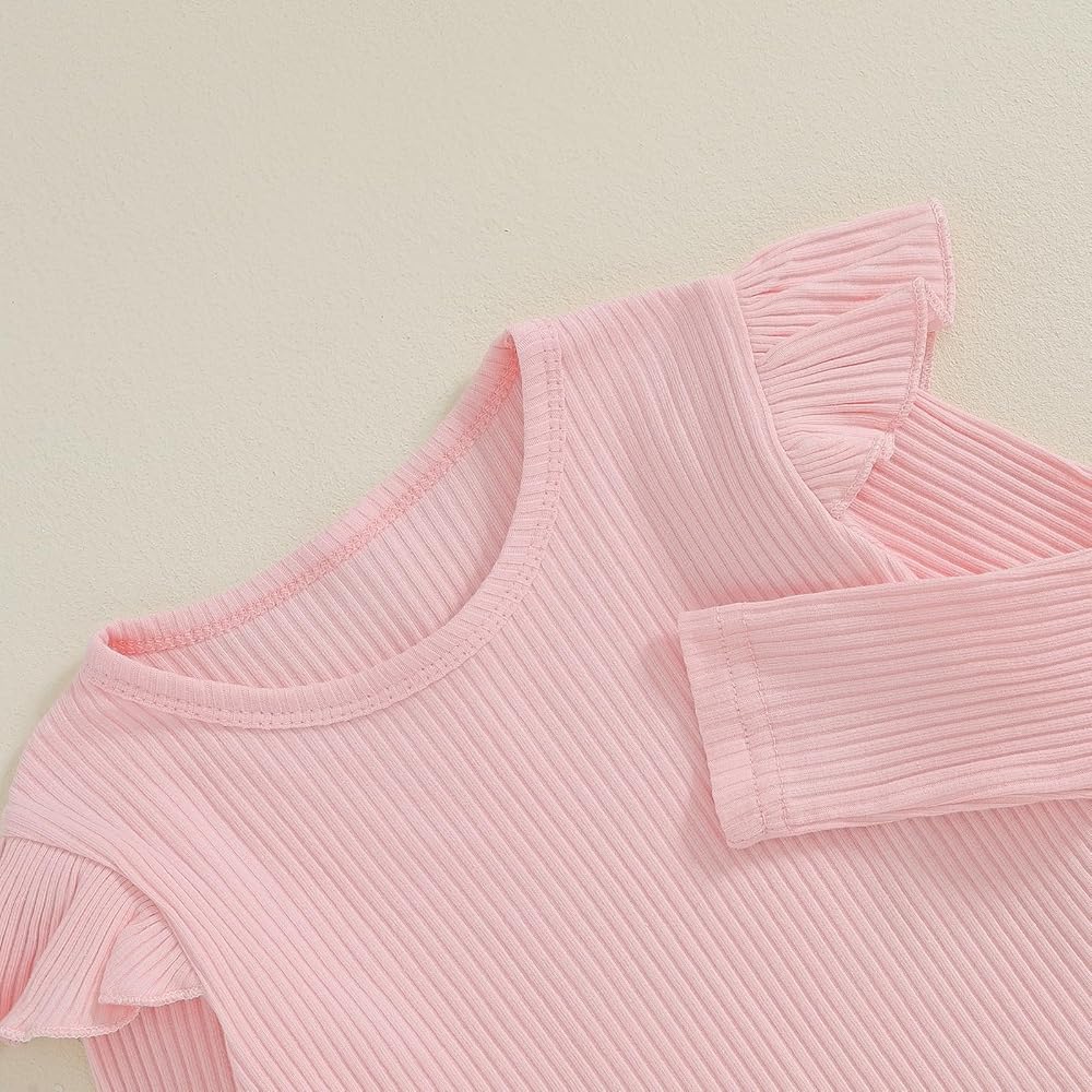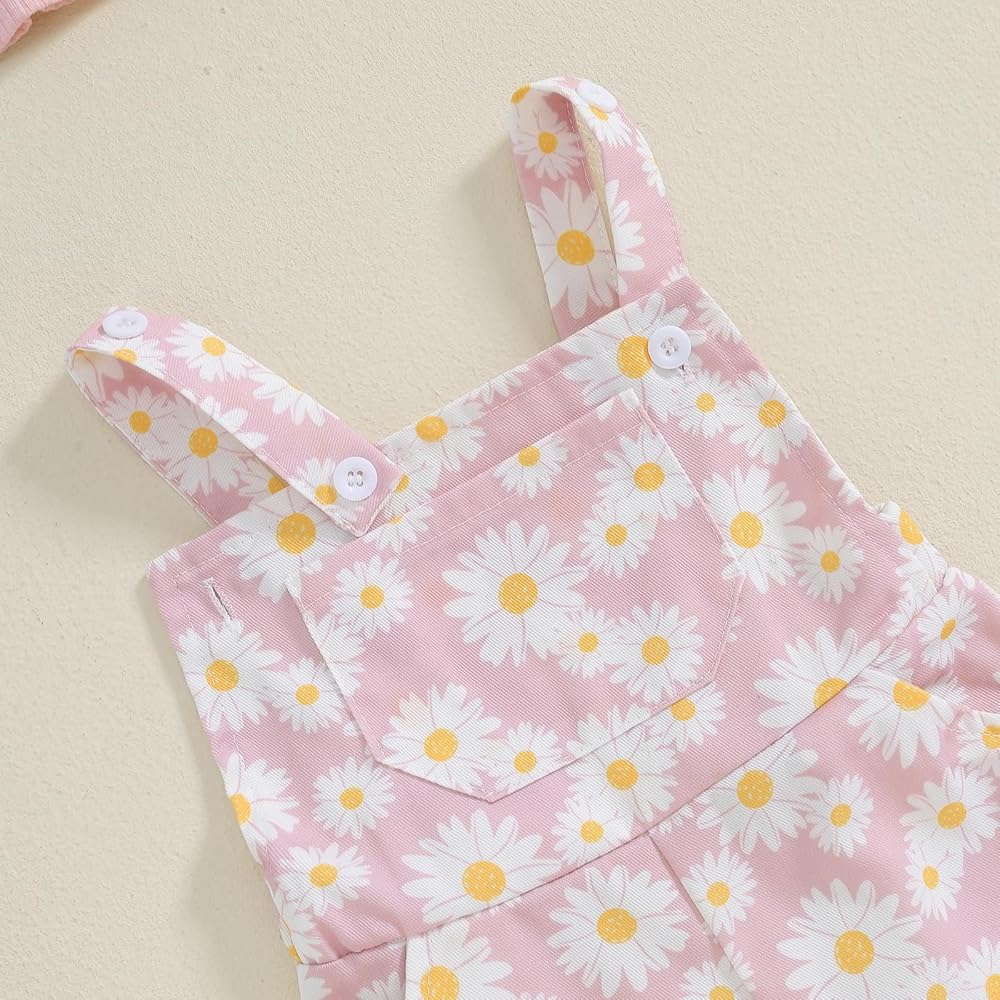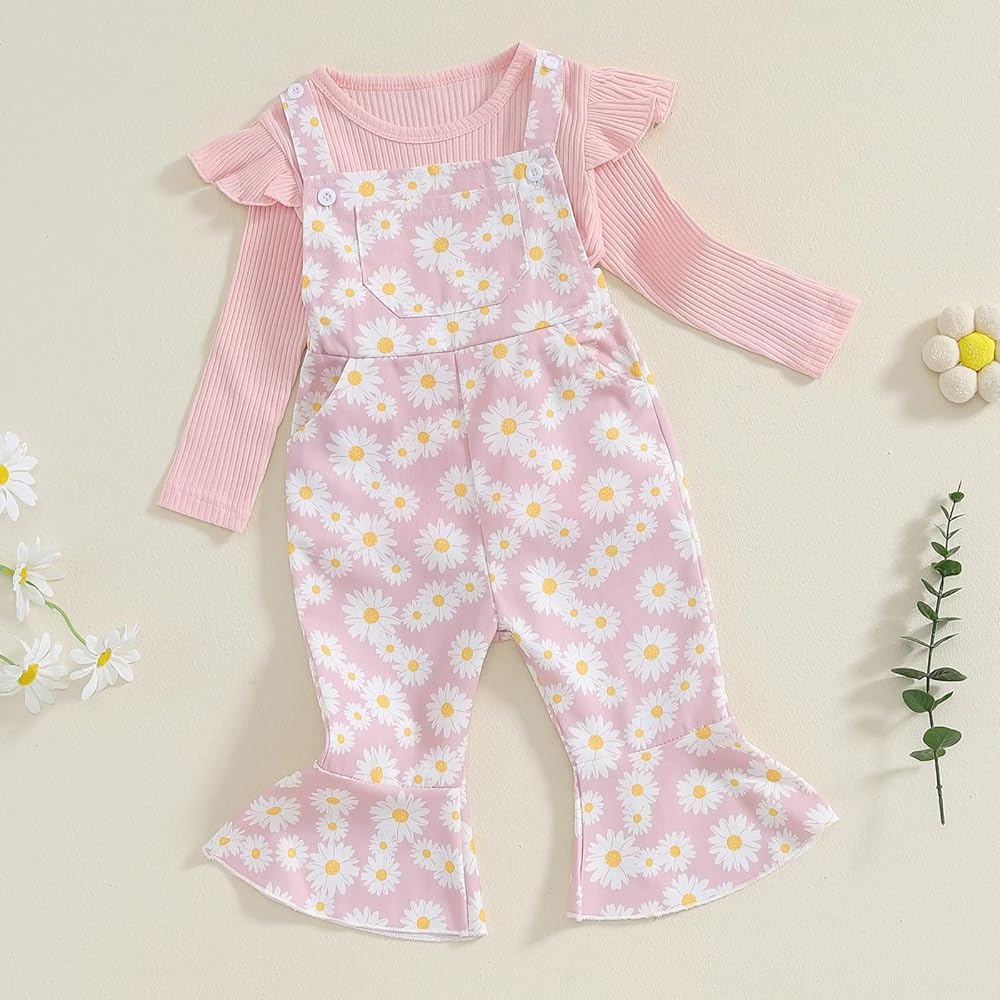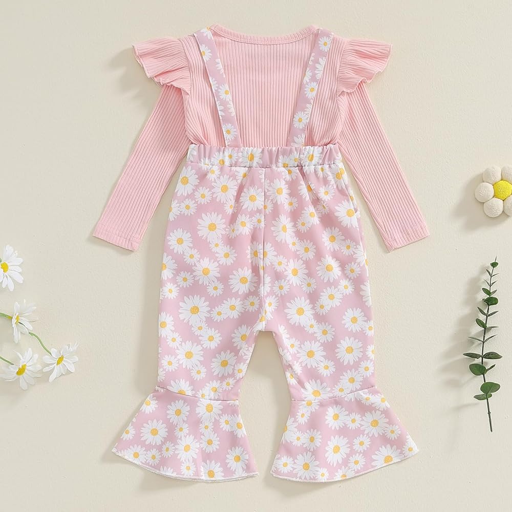 Toddler Baby Girl Fall Outfits Long Sleeve Ribbed Tops Floral Suspender Overalls Flared Pants Set Kids 2Pcs Clothes