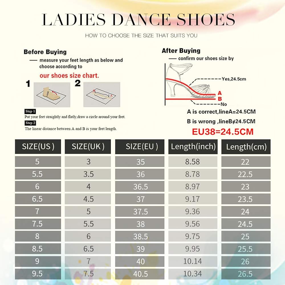 Size: Latin Dance shoes should be fit closer to the foot than other regular shoes, for better fit, please measure the length of foot and choose the size according to the size chart in the last picture.