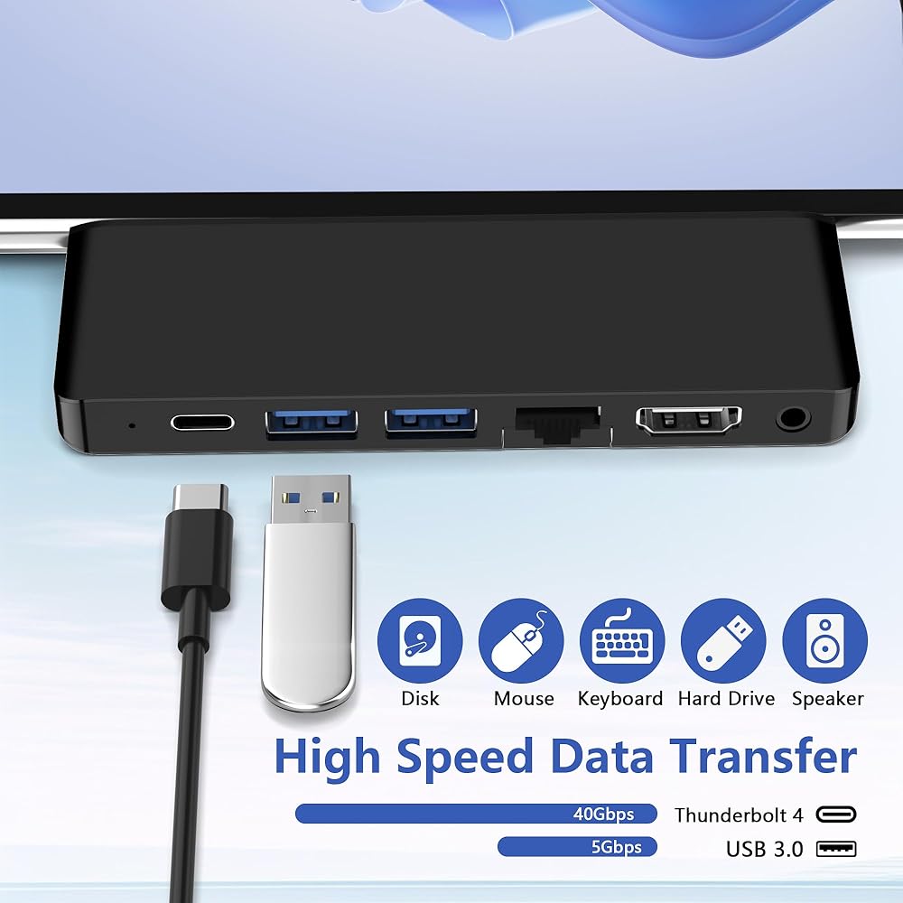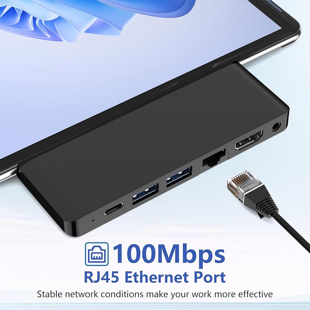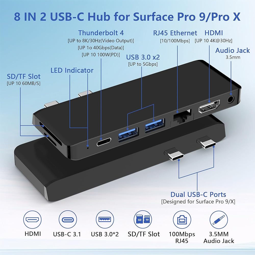 [مصمم لجهاز Surface Pro 9/Pro 10/Pro X]: مصمم لجهاز Microsoft Surface Pro 9/Pro 10/Pro X. قم بتوسيع منفذي USB C إلى 8 منافذ (2* منافذ USB 3.0، منفذ HDMI 4K، منفذ Thunderbolt 4 ( صوت 8K + نقل البيانات + شحن PD)، منفذ إيثرنت 100M RJ45، فتحة بطاقة SD & TF (Micro SD)، صوت 3.5 مم)، يلبي بسهولة احتياجات الاستخدام اليومي، التوصيل والتشغيل. (ملاحظة: إذا كنت تستخدم حافظة واقية، فلن تناسب جهاز Surface Pro 9 أيضًا.)