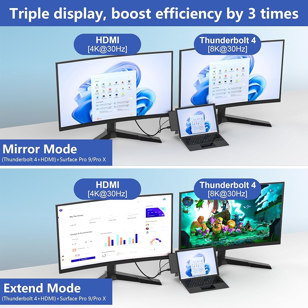 [محطة إرساء ثلاثية العرض لجهاز Surface Pro 9]: شاشة ثلاثية (Ultra HD 4K HDMI + USB-C Thunderbolt 4) + وضع Surface Pro 9. استخدم شاشات مختلفة لمشاريع مختلفة لجعل عملك/حياتك أكثر كفاءة. يدعم الوضع الممتد أو المتطابق، دقة HDMI تصل إلى 4K@30 هرتز، دقة USB-C Thunderbolt 4 تصل إلى 8K@30 هرتز؛ أداة مثالية لمحرري الفيديو والمصورين والمبرمجين.