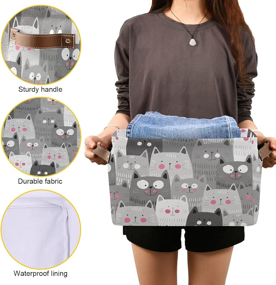 المواد: قماش كتاني على الطبقة الخارجية الخارجية، قماش مقاوم للماء 300DPE كطبقة داخلية، حلقة فولاذية مدمجة في الأعلى، ليس من السهل تشويهه، مقبض جلدي قوي يجعل من السهل حمله أو سحبه وإخراجه من الأرفف؛ الحجم: 15 (طول) × 11 (عرض) × 9.5 (ارتفاع) بوصة