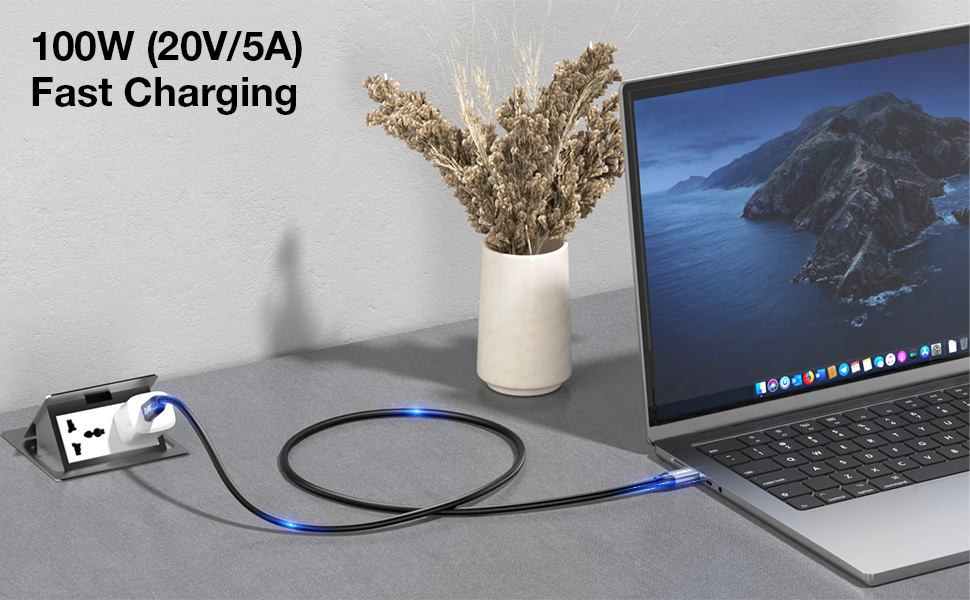 【يدعم الشحن السريع بقدرة 100 وات】يدعم كابل الشحن السريع من النوع C الشحن السريع PD3.0 وQC3.0 مع مخرج بحد أقصى 100 وات (20 فولت 5 أمبير). يمكنك إقرانه مع شاحن توصيل الطاقة USB-C بقدرة 100 واط لتشغيل جهاز MacBook Pro 16ʺ خلال ساعة واحدة. (ملاحظة: هذا كابل شحن لنقل البيانات وإصدار USB 2.0، ولا يدعم إخراج الفيديو.)