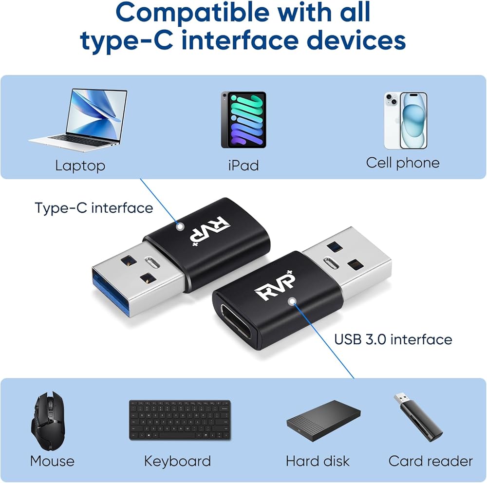 • WIDE COMPATIBILITY - RVP+ USB to USB C adapter remarkably partners with any USB Type-C port. The USB Type C to USB Adapter lets you connect standard USB computer accessories/cables to USB-C or Thunderbolt 4/3 devices, such as recent MacBook Pros and Airs, iPad Pros and Air 4, iPhone 15, Chromebook, Pixelbook, Surface Go, Samsung Galaxy series, Note series, and other Type C devices.