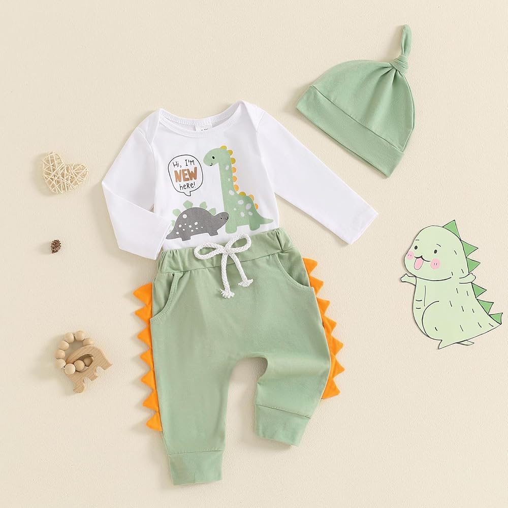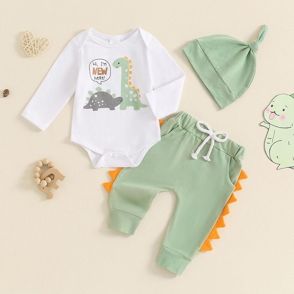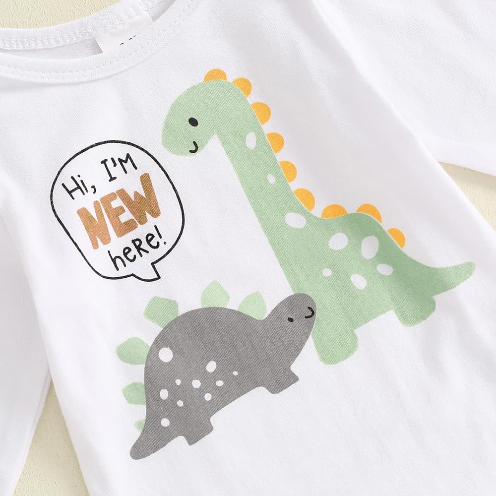 Design: Adorable baby boy long sleeve romper and pants set, Hi I'm new here and dinosaurs print, long sleeve bodysuit jumpsuit tops, snap closure for diaper change, elastic waist pants and a matching hat. Comfy and cute newborn baby boy coming home from hospital outfit, makes your little one more cute and attractive.