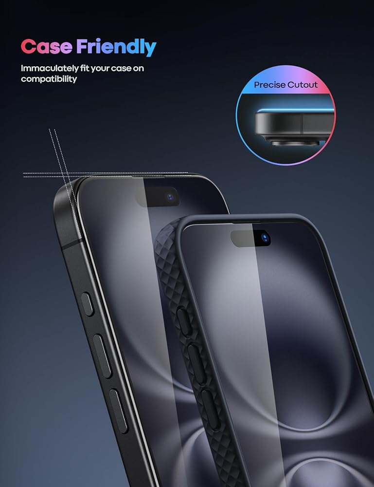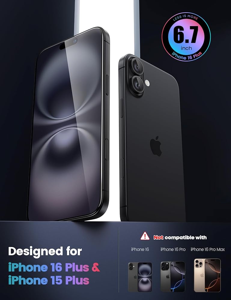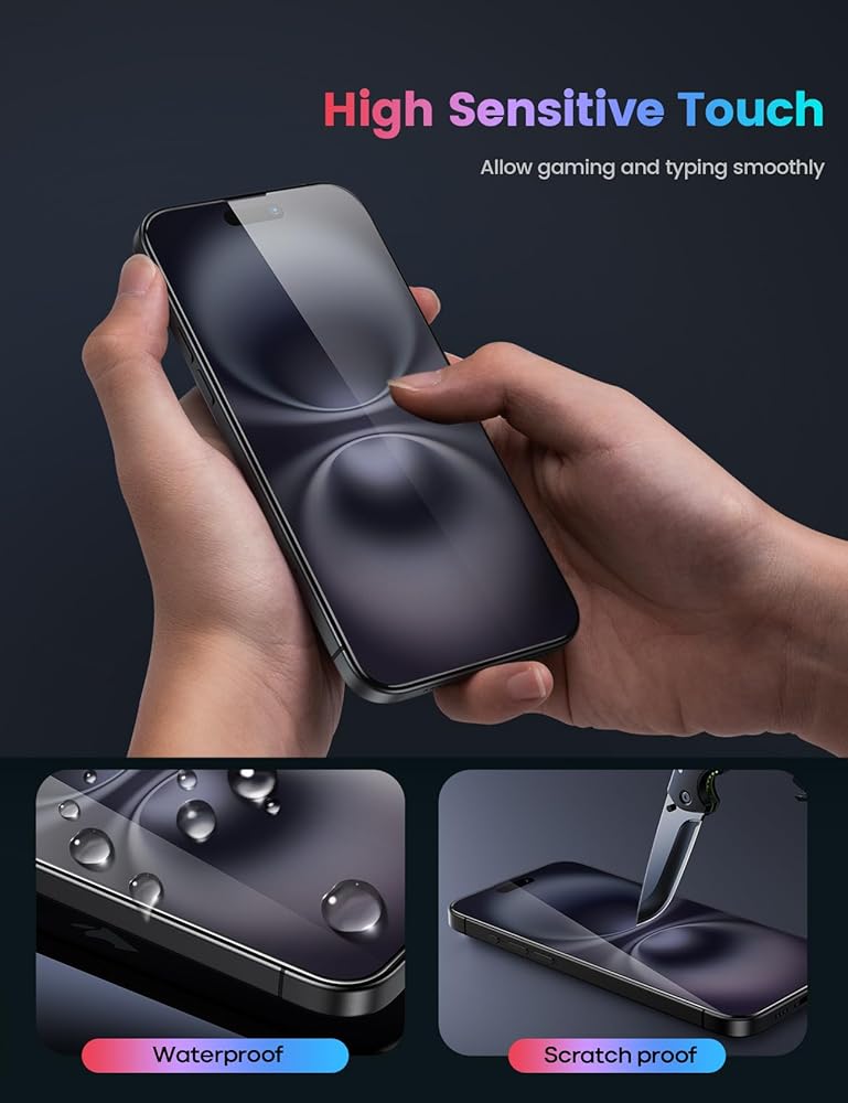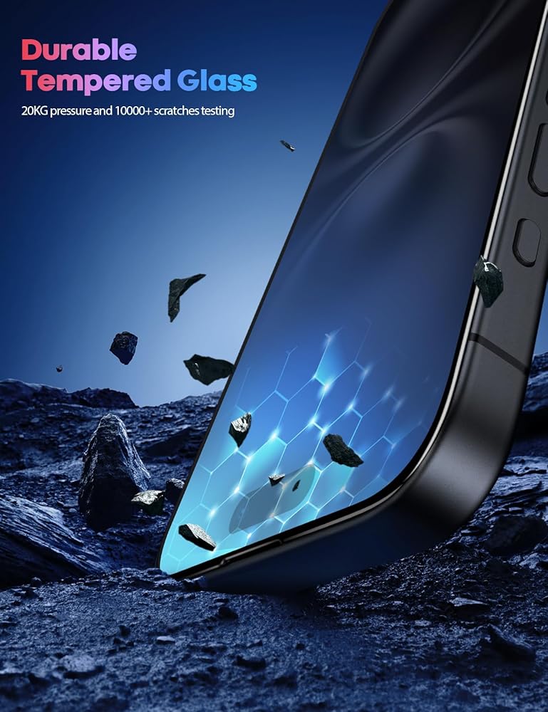 【مقاوم للكسر من الدرجة العسكرية】 واقي الشاشة الزجاجي المقوى لهاتف iPhone 16 plus مصنوع من 6 طبقات من المواد الدقيقة. مع صلابة تزيد عن 9H، فقد اجتاز اختبار الضغط 20 كجم وأكثر من 10,000 مرة اختبار التآكل دون كسر أو خدش. وبالتالي، فهو يحمي الهاتف من التلف العرضي أو الخدوش الناجمة عن الأشياء الصلبة مثل المفاتيح (حتى السكاكين).