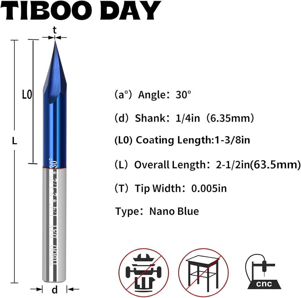 • طلاء Tiain المحسن: تتميز لقمة نحت جهاز التوجيه V Groove بطبقة تيان متقدمة، وتتميز بصلابة نانو تبلغ 4600HV، ودرجة حرارة خدمة قصوى تبلغ 1200 درجة مئوية، ومعامل احتكاك يبلغ 0.4μ.