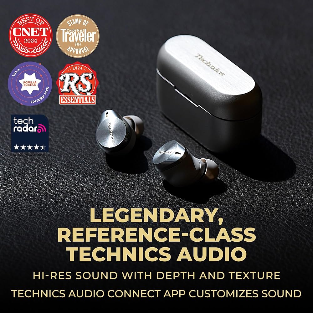 Stay on top of your game with impressively powerful, noise cancelling AZ80 wireless ear buds with reference-quality sound. Discover legendary recorded music as you've never heard it before with Technics' highest-resolution audio, giving you the feel of the arena, an exclusive club, or in-studio magic; hear all the incredible details, from the warm timbre of a singer's voice to the thrill of the beat drop. Like you, these bluetooth earphones work as hard as they play, with state-of-the-art noise cancellation so you can focus on your critical business. A must-have for high-priority business calls, AZ80 buds ensure you voice comes through seamlessly on every call, with enhanced JustMyVoice technology using 8 MEMS microphones and an advanced noise-reducing algorithm to minimize outside interference. Now you can connect to more than two devices at the same time – Technics' Multipoint technology allows you to connect to three Bluetooth devices simultaneously, keeping you connected to your computer, tablet and phone at once and giving you the ability to multitask with flow, whether you're on a plane or on the golf green. Charge wirelessly (Qi compatible) to keep your workspace and bedside table neat; supports wireless hi-res audio using state-of-the-art Bluetooth with LDAC compatibility. Noise cancellation, EQ, and more are customizable through the Technics audio app so you can always have sound just as you want it.