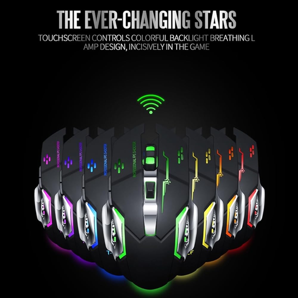 ماوس ألعاب بلوتوث لاسلكي قابل لإعادة الشحن مع 7 ألوان قوس قزح RGB وإضاءة خلفية للتنفس ونقطة لكل بوصة قابلة للتعديل - قبضة مريحة، نقرة صامتة، توفير الطاقة متوافق مع كمبيوتر محمول PC Mac (أسود نجمي)