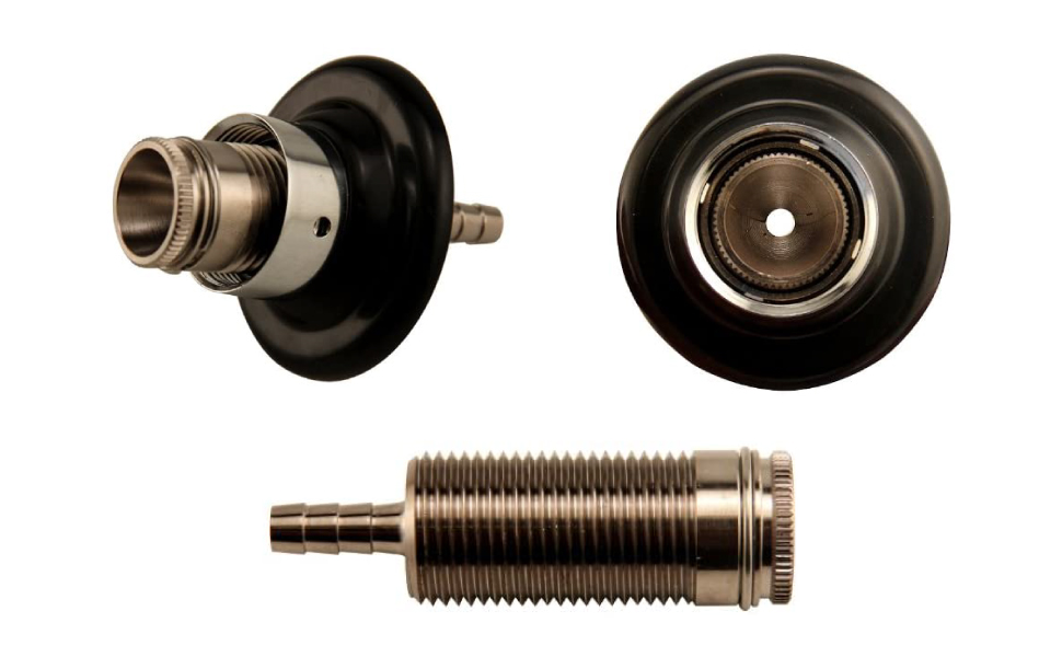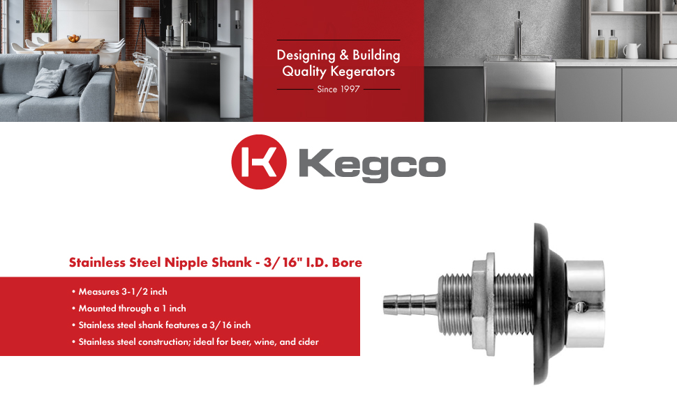 This stainless steel shank is 2 1/8 inch long measured from the end of the Threading to the end where the faucet attaches. All stainless steel contact construction makes it ideal for beer, wine, and Cider. The stainless steel shank comes with a black plastic flange on the front and a compression ring on the back. Forged Brass lock nut. 3/16 inch ID beer line connection.