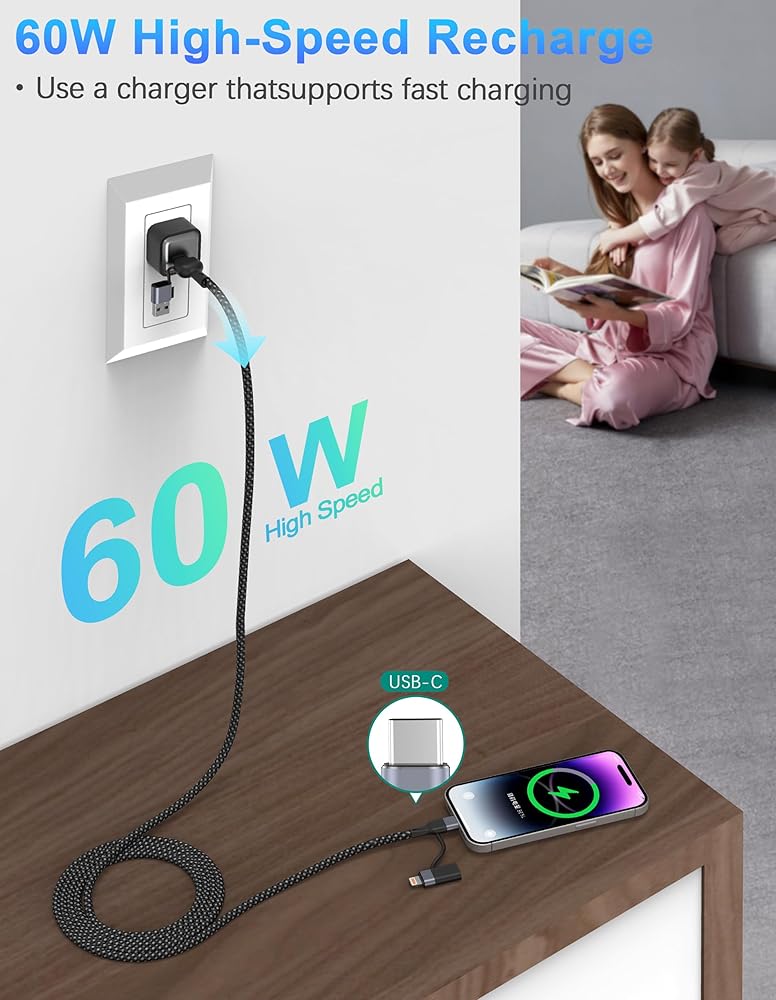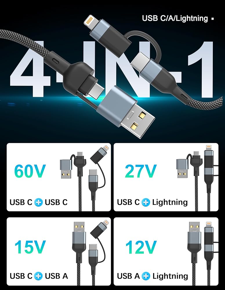 ⚡ PLUG AND PLAY WITHOUT REMOVING THE CASE: We designed our 2mm connector extension cable to easily charge without removing the case while protecting the USB-C and fast charging connectors. High-speed data transfer: Transfer movies, music, or more in seconds at 480 Mbps. ⚡ 4in1 USB CHARGING CABLE: The USB Charging Cable is designed with simplifying your life in mind. Charge any of your devices with the 4-in-1 USB C Charging Cable, which combines 4 ports,Ⅰ:USB A to USB C(15W),Ⅱ:USB A to Lightning(12W) Ⅲ:USB C to Lightning(27W),Ⅳ:USB C to USB C(60W), one cable meets all the needs! No need to carry multiple cables for different devices. 👍Durable USB C Charging Cable: The USB C lightning cable is made of zinc alloy for extreme durability and flexibility. Lasts up to 50 times longer than ordinary cables,proven in laboratory environments to withstand 40,000+ bends and never break. 👍Universally Compatible: USB C cables are compatible with virtually all USB-C devices, including cell phones, tablets, and laptops. Compatible with iPhone 15/15 Plus/15 Pro/15 Pro Max, Samsung Galaxy S23 Ultra/S23+/S23/S24 Ultra/S24+/S24 /S22 Ultra/S22+/S22/S21 Ultra/S21+/S21/S20/ S20+/S20 Ultra /Note20, MacBook Air/Pro, Pixel series, iPad Mini 6, iPad Pro, iPad Air, Steam Deck, and more devices with USB-C ports. 👍 Easy to Carry:length 4ft/120cm for home, office, car, travel or other occasions.4 in 1 USB charging cable is easy to fold and fit into your handbag, laptop bag, pocket, etc. You can lie down on the sofa and use your device while charging. Allows you to use it freely in your bedroom, office or even in the backseat of your car. 🎁What You Get:1Pack 4in1 multi charging cable 4ft with 18-month warranty and 24/7 customer service. values your shopping experience, our efficient 24-hour customer service aims to provide you with the best shopping experience.