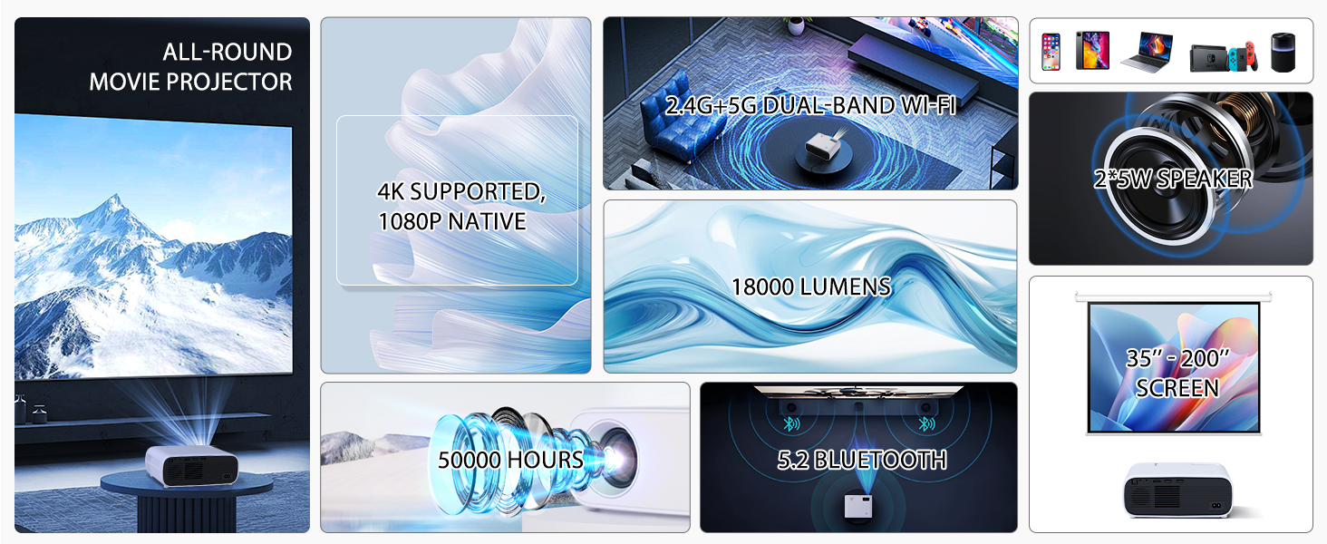 وظيفة Wifi وBluetooth: انعكاس شاشة WiFi اللاسلكية 2.4G+5G يجعل جهاز عرض المسرح المنزلي يعمل بشكل أسرع وأكثر استقرارًا لتستمتع بشكل أفضل بتجربة التقاط الشاشة. من خلال اتصال Bluetooth، يمكنك بسهولة توصيل جهاز عرض Bluetooth 1080P الخاص بك بمكبرات صوت Bluetooth.