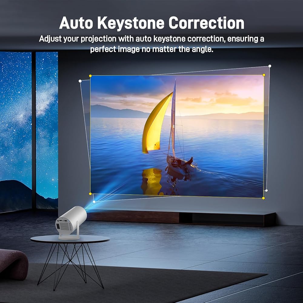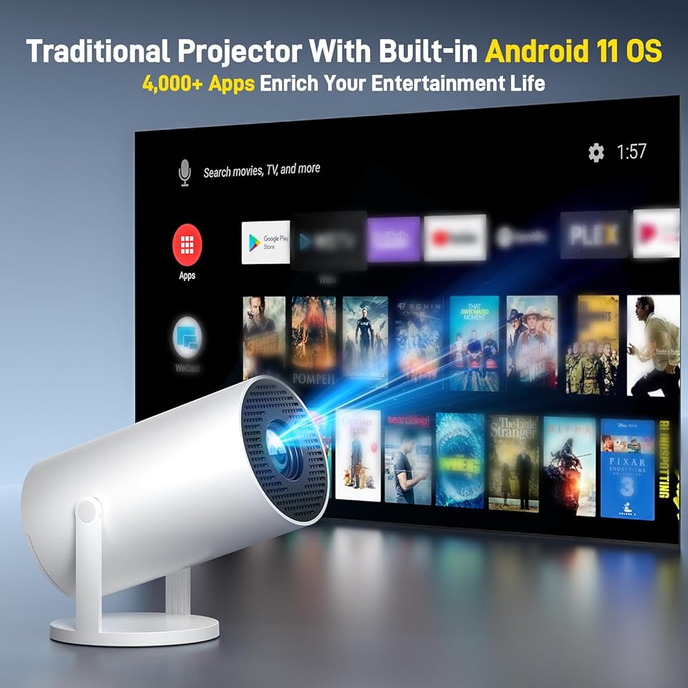 جهاز عرض صغير ذكي 40 بوصة - 150 بوصة فك تشفير 4K مخرج 1280*720 بكسل، جهاز عرض محمول مع جهاز عرض أفلام خارجي قابل للدوران بنظام Android 11,180 درجة للهاتف، تصحيح الانحراف التلقائي، دعم WiFi 6، BT 5.4