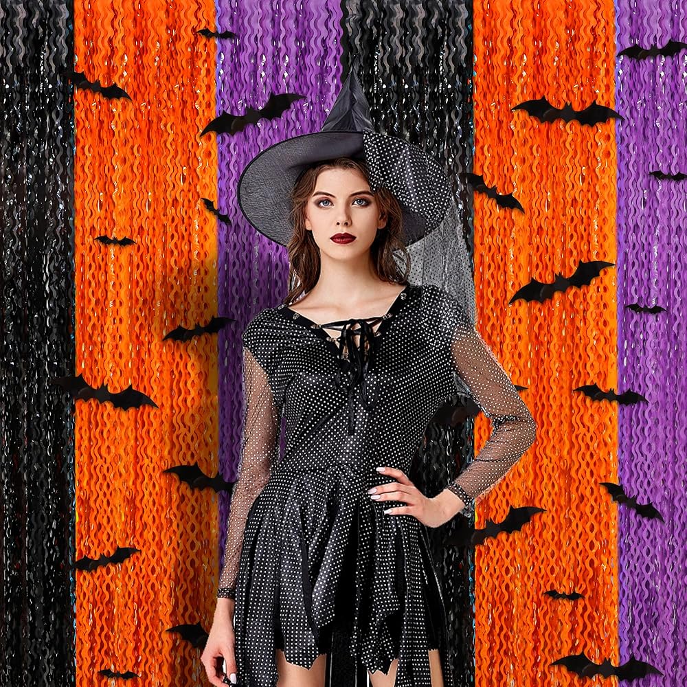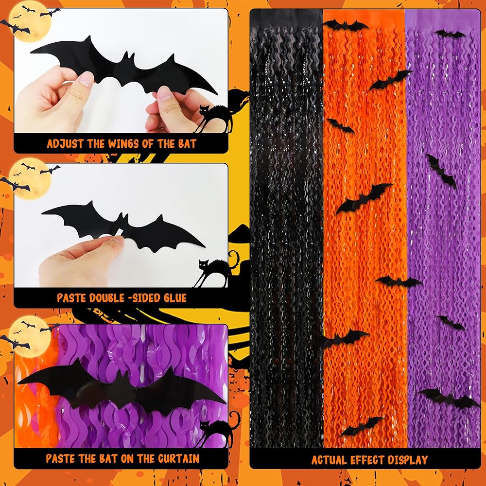 [عبوتان و40 قطعة] ستائر الهالوين ذات أهداب من رقائق معدنية، قطعتان من الستائر المتموجة باللون الأسود والبرتقالي مع 40 قطعة من ملصقات الخفافيش البلاستيكية (3 أحجام) لدعائم حفلات الهالوين وديكورات حفلات الهالوين