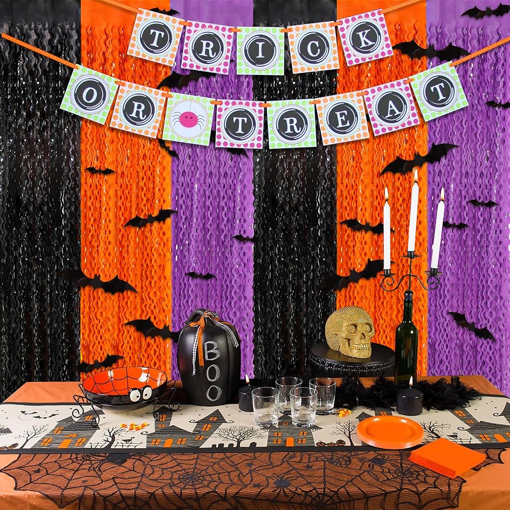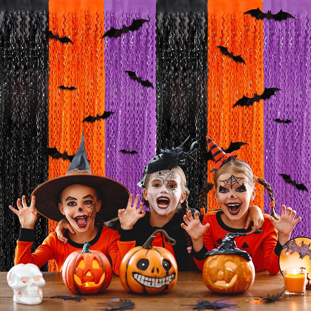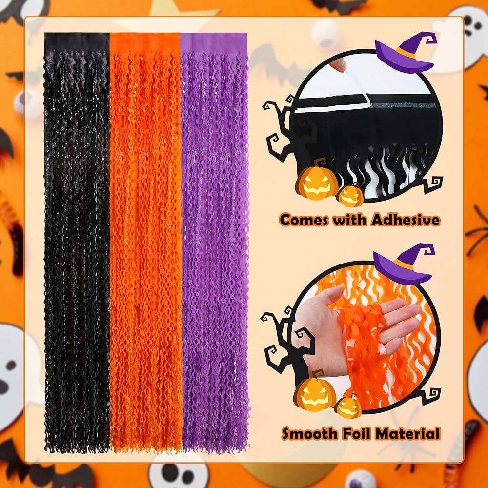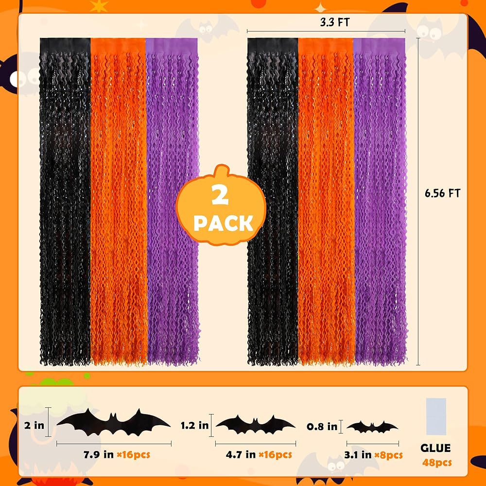 تشمل العبوة - سوف تحصل على عبوتين من ستائر الهالوين السوداء والبرتقالية والأرجوانية المموجة ذات الشراشيب و40 قطعة من ملصقات الحائط ثلاثية الأبعاد من مادة PVC مع 3 مقاسات و40 قطعة من الغراء الصلب. كافية لديكورات الهالوين الخاصة بك.