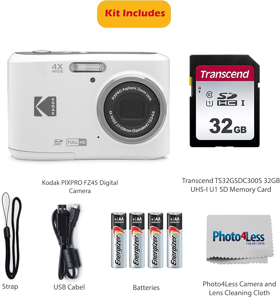 • BUNDLE INCLUDES: Everything you need to start snapping right out of the box, including KODAK PIXPRO FZ45 Camera (Black), AA batteries (4 Pack), 32GB SD memory card, Wrist Strap, and Photo4Less lens cleaning cloth.