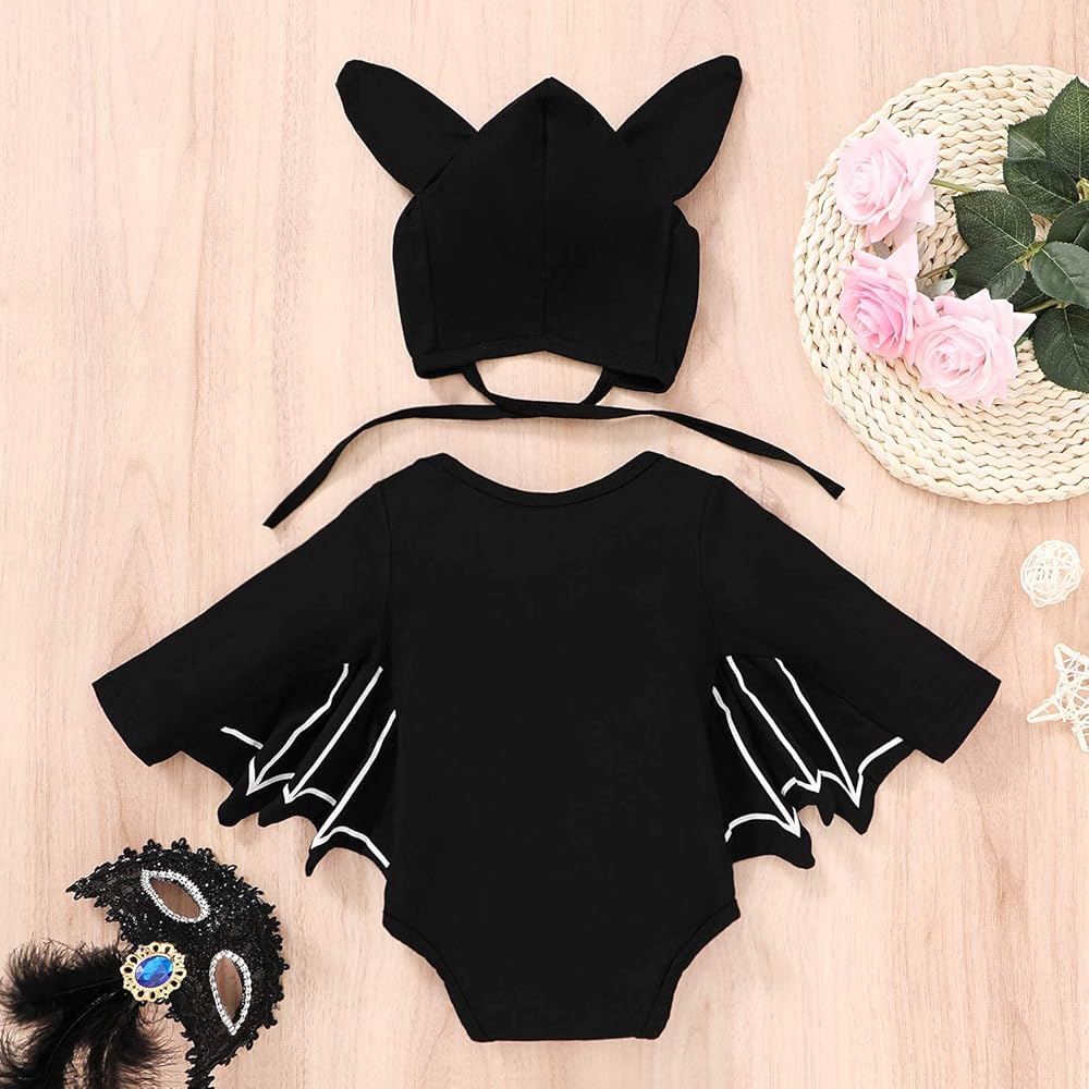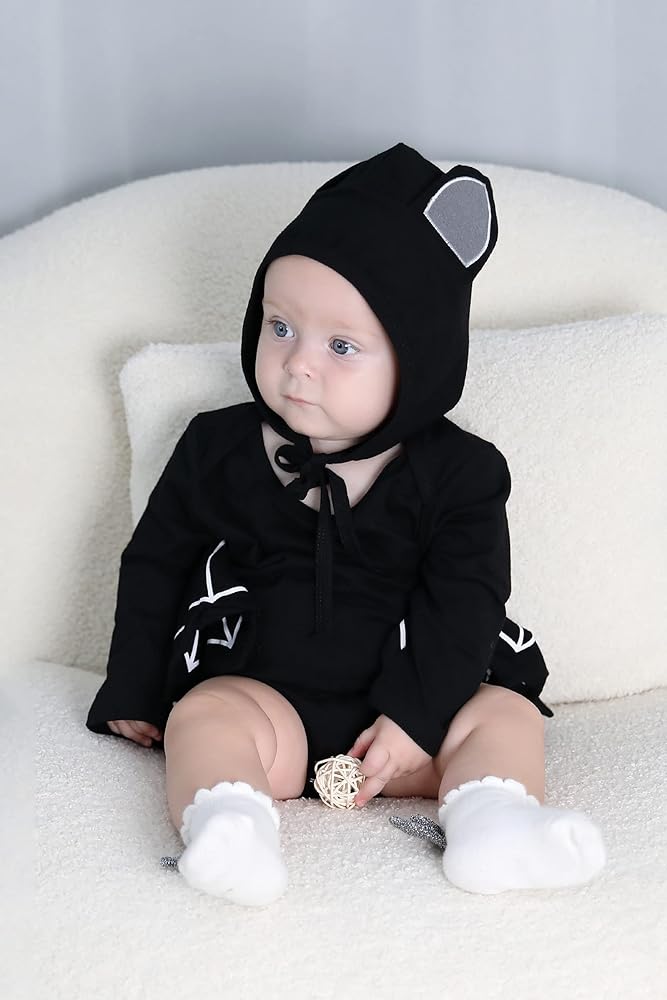 Adorable Baby Bat Outfits, Black Solid Color, Long Sleeve O Neck Jumpsuit With Ear Hat