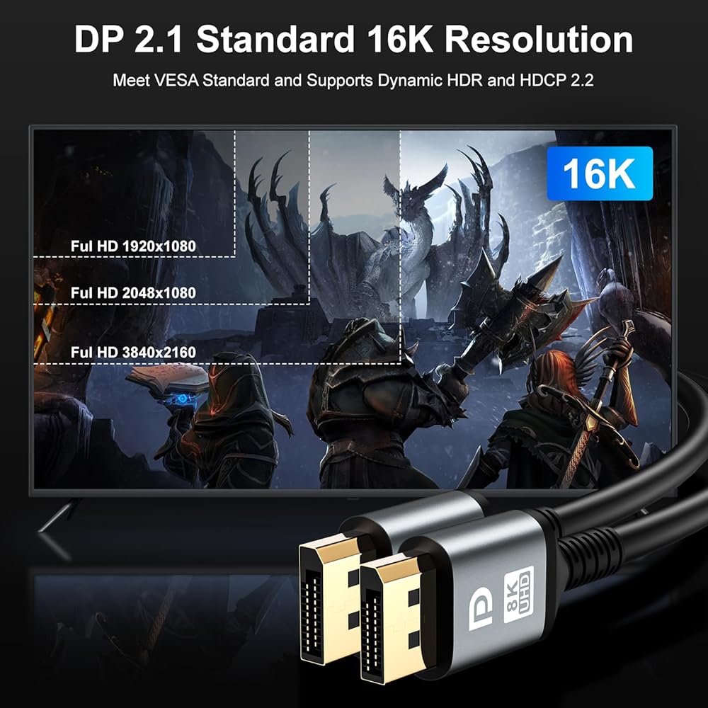 [16K DisplayPort Cable 2.1] - يدعم الدقة العالية 4K@240 هرتز/165 هرتز/144 هرتز، 16K@60 هرتز، 8K@120 هرتز، 2K@240 هرتز، يدعم HDR الديناميكي وHDCP 2.2. ومتوافق مع الإصدارات السابقة مع DisplayPort 1.4 1.3 و1.2 و1.1 و1.0.يدعم كابل DP 2.1 عرض النطاق الترددي بسرعة 40 جيجابت في الثانية