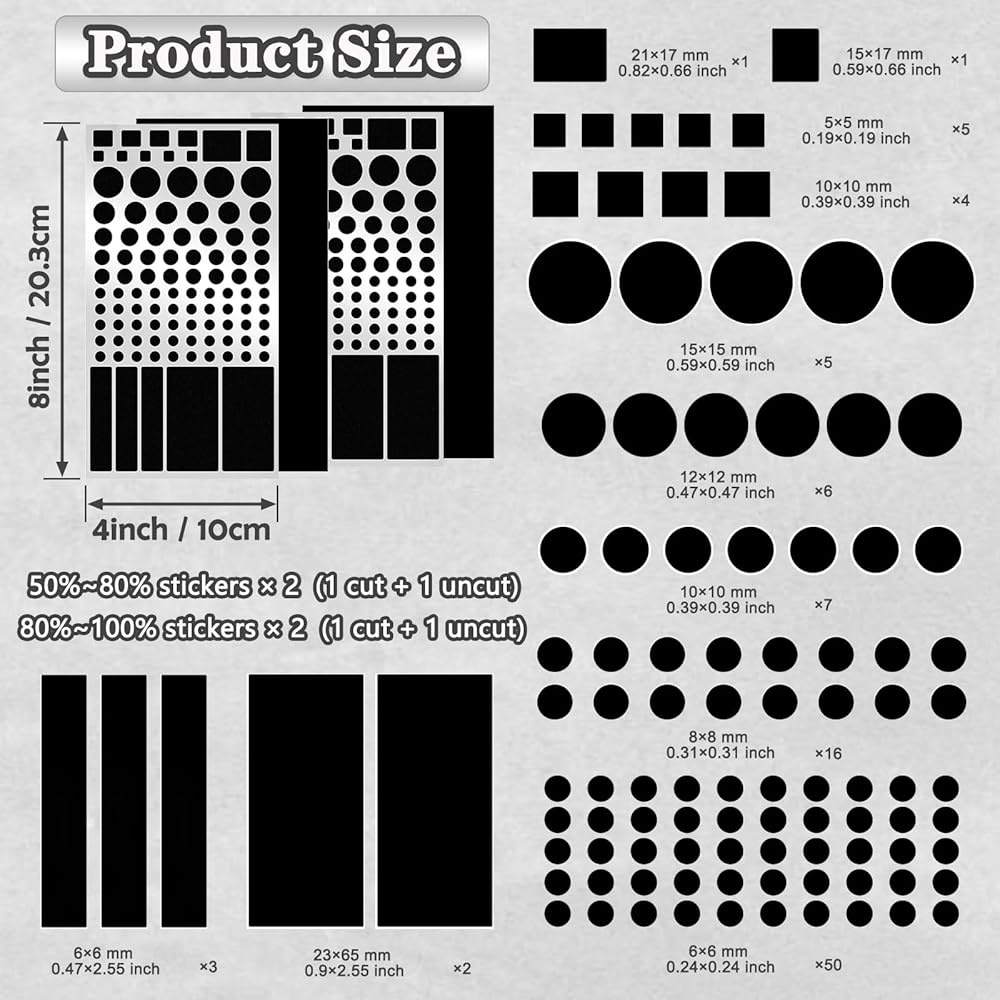 You will receive 4 sheets blackout stickers, 2 sheets 50% to 80% light dimming stickers (including 1 cut and 1 uncut) and 2 sheets 80% to 100% light dimming stickers (including 1 cut and 1 uncut). LED light blocking stickers come in 3 shapes: round, square and rectangular. You can cut them to meet your needs.