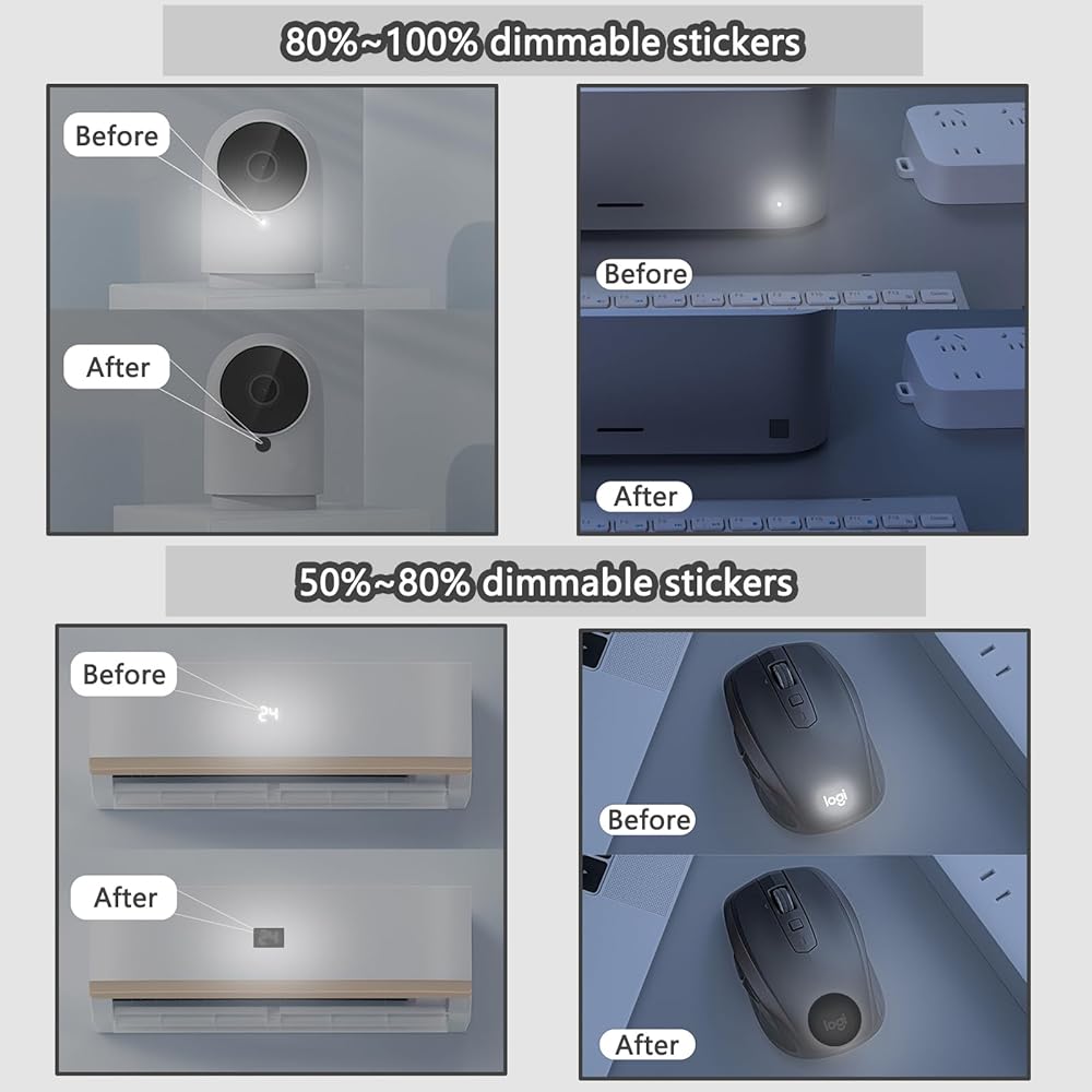 Light dimming stickers can block 50%-80% or 80%-100% of LED lights, which will dim the LED lights of electronic products. Suitable for all appliances and electronic devices in your home, help you not be affected by LED lights and help to rest and sleep.