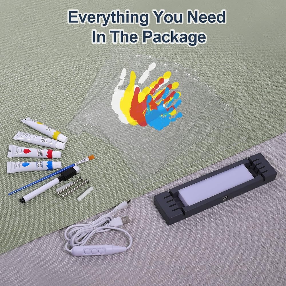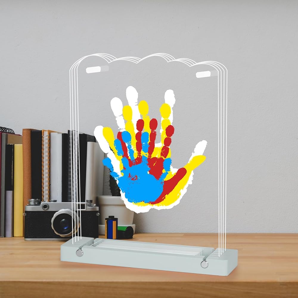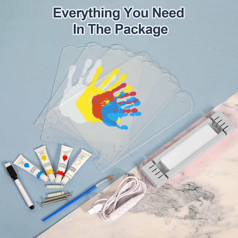 مجموعة حفظ حديثي الولادة - تشتمل مجموعة يد الطفل وبصمة القدم هذه على قاعدة خشبية بيضاء مخصصة، و4 أوراق أكريليك، وكابل إضاءة USB، وأربعة ألوان قابلة للغسل (أحمر، أصفر، أزرق، أبيض)، فرشاة، قلم تحديد أسود، ومسامير تجميع. يرجى قراءة دليل تعليمات المنتج بالكامل لفهم كيفية تحقيق أفضل النتائج. أبعاد التجميع: 7.9 بوصة × 2.0 بوصة × 10.6 بوصة