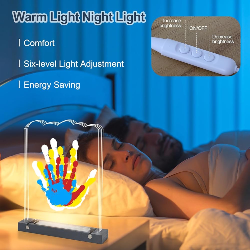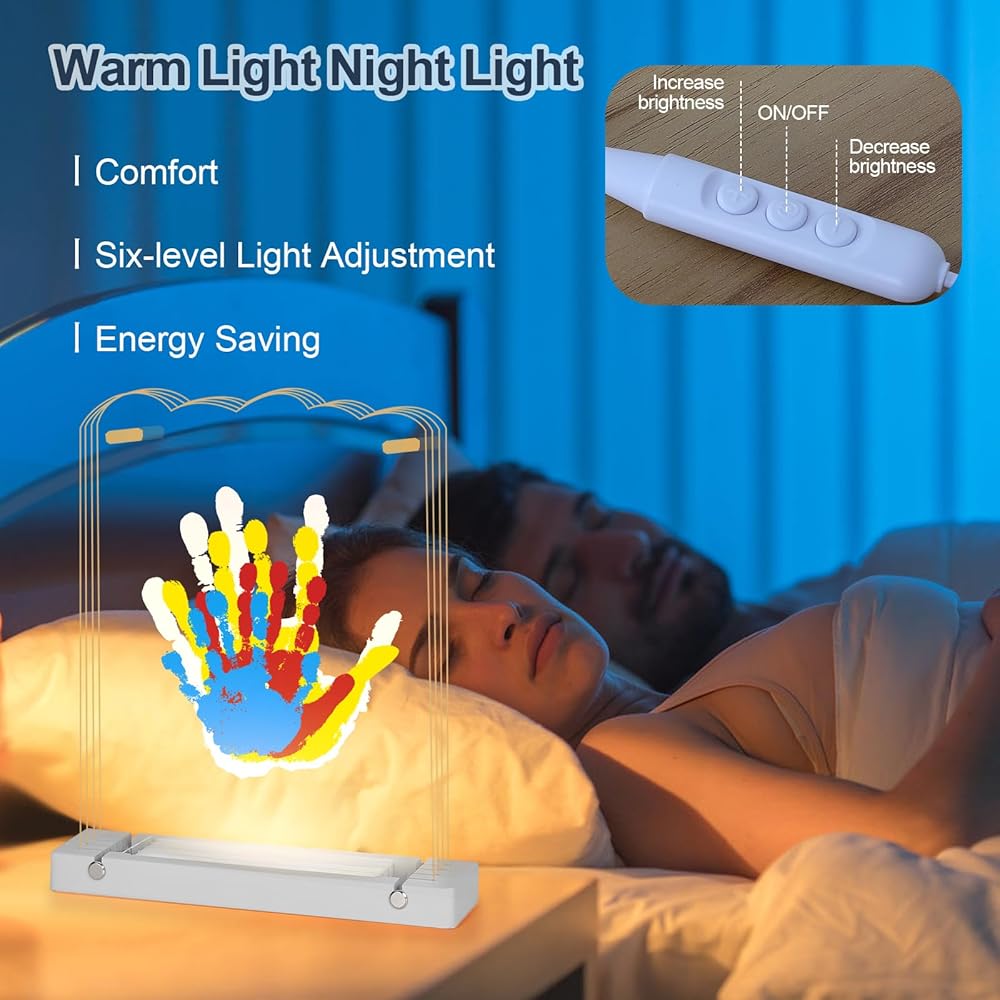 تصميم إضاءة ليلية - تتميز مجموعة بصمة اليد الخاصة بنا بمصباح LED مثبت خصيصًا مع تعديل سطوع بـ 6 مستويات. خلال النهار، فهو بمثابة إضافة تزيينية للغرفة، مما يضيف جمالاً. في الليل، يخلق الضوء الدافئ واللطيف شعورًا بالأمان والراحة. سواء تم وضعها في غرفة النوم، أو غرفة المعيشة، أو غرفة الأطفال، فإن بصماتها اليدوية المخصصة تكمل ديكور منزلك بإضاءة ناعمة، مما يعزز الجو العام