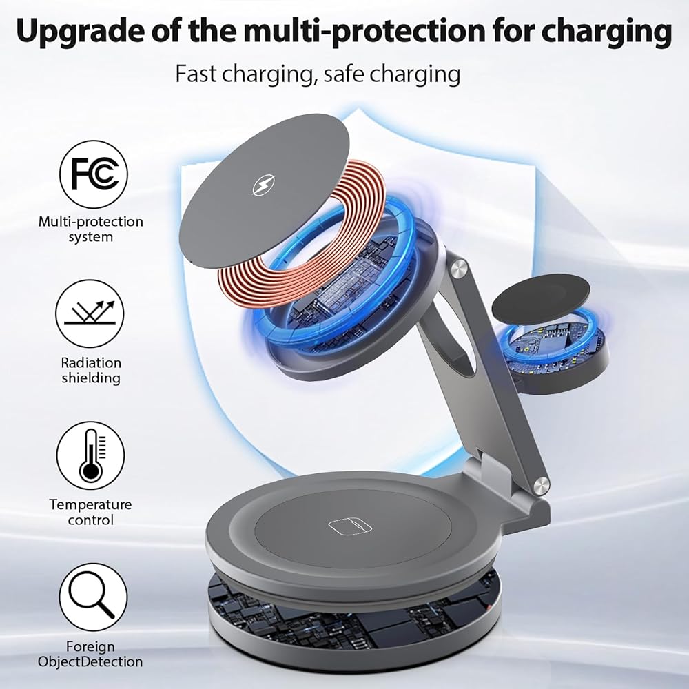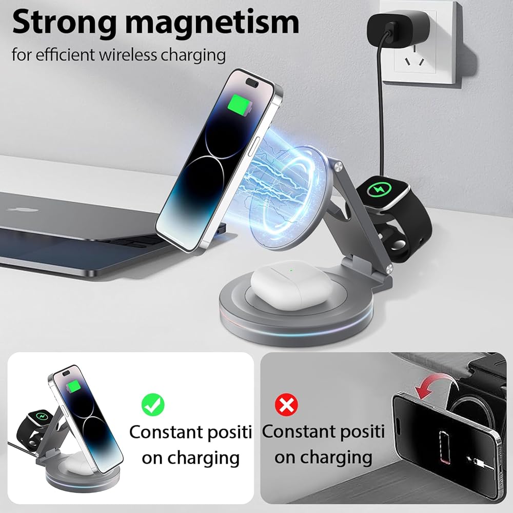 【محاذاة تلقائية مع مغناطيسية قوية】تستخدم قاعدة محطة الشحن تقنية مغناطيسية متقدمة، والمحاذاة الفورية والدقيقة توفر لك تجربة شحن لاسلكية مغناطيسية سريعة ومستقرة في أقل من ثانية واحدة.