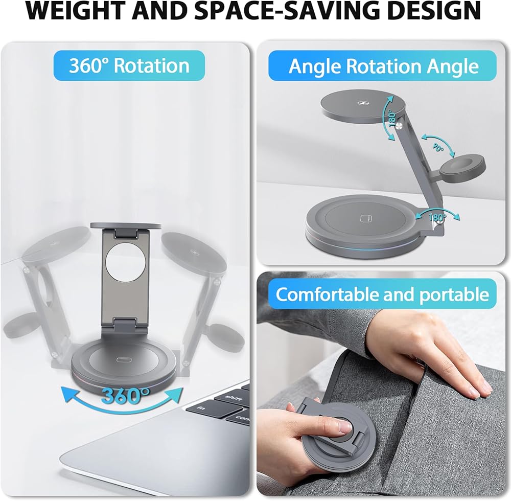 【قاعدة دوارة 360 درجة】يمكن تدوير قاعدة محطة شحن Apple 360 درجة، وهي ليست مريحة لك فقط لمشاركة المحتوى الخاص بك، ولكن أيضًا من السهل ضبط زاوية الرؤية. سواء كنت في المكتب أو في المنزل أو مسافرًا، فإن محطة الشحن متعددة الوظائف هذه لساعة Apple Watch وiPhone تتكيف بشكل مثالي مع احتياجاتك اليومية وتوفر تجربة شحن مرنة ومريحة.