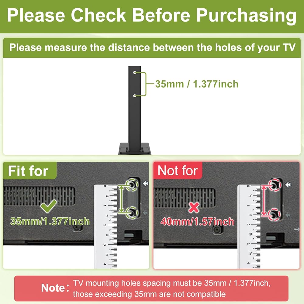 • ---Compatibility Check--Before purchasing, please measure the TV hole spacing to ensure it meets the stand's hole spacing 35 mm/1.377 inch for a perfect fit and verify that your TV model is listed