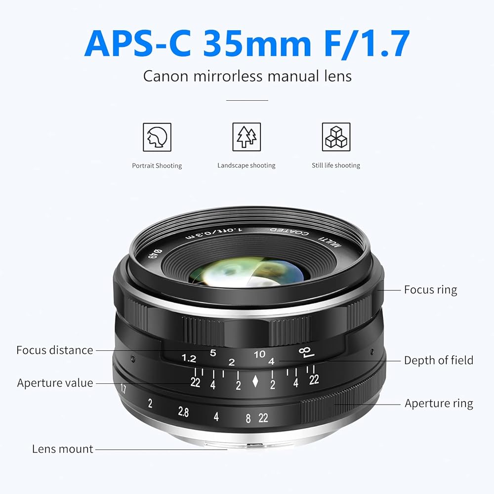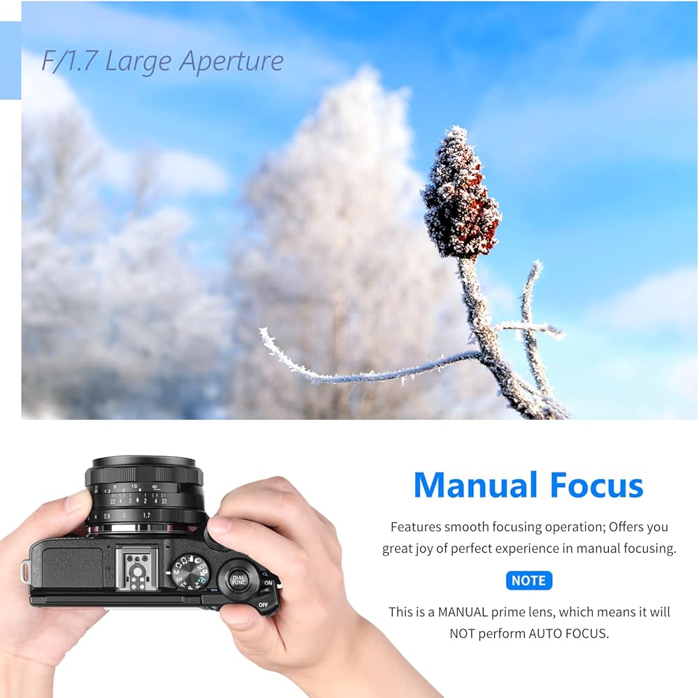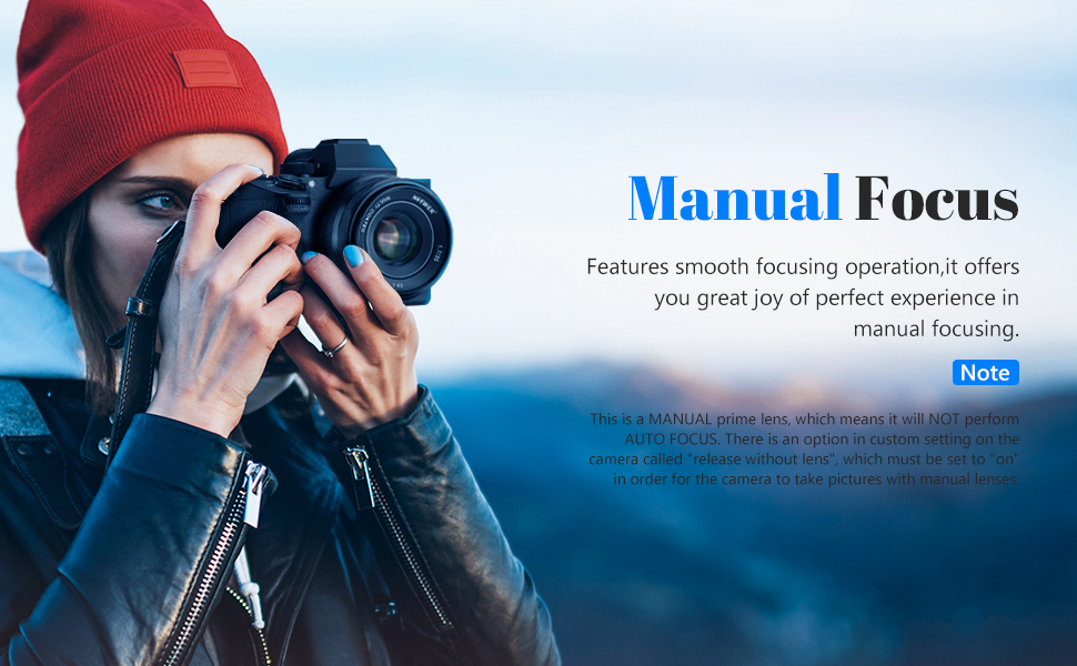 • العدسة غير مرفقة: تحتاج العدسة اليدوية إلى تمكين "وضع M" أو "التحرير بدون عدسة" في إعداد الكاميرا. ملاحظة: إنها متوافقة أيضًا مع Sony A7III، ولكن فقط عندما يتم ضبط الكاميرا في وضع APS-C، يمكن أن تعمل العدسة