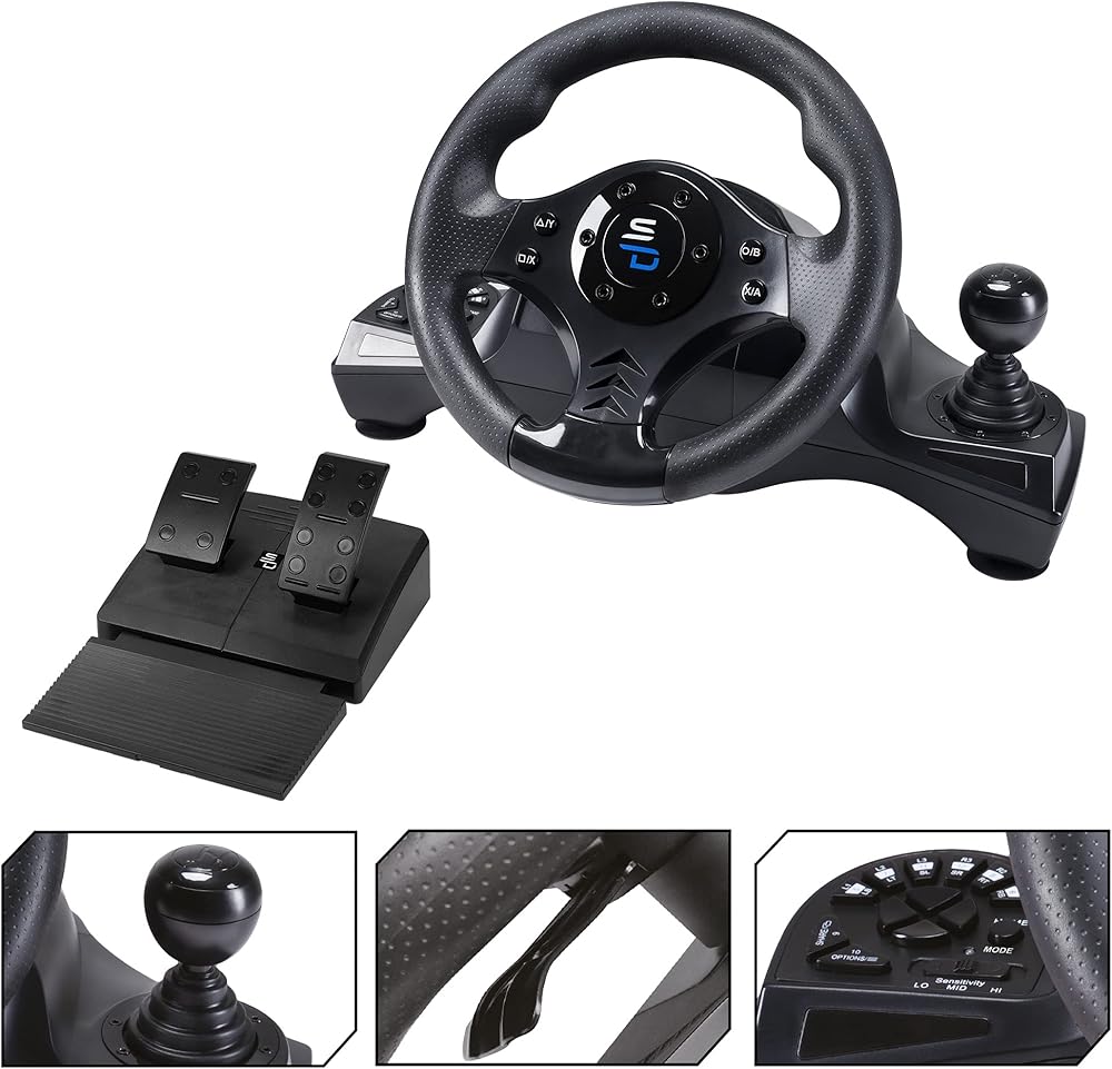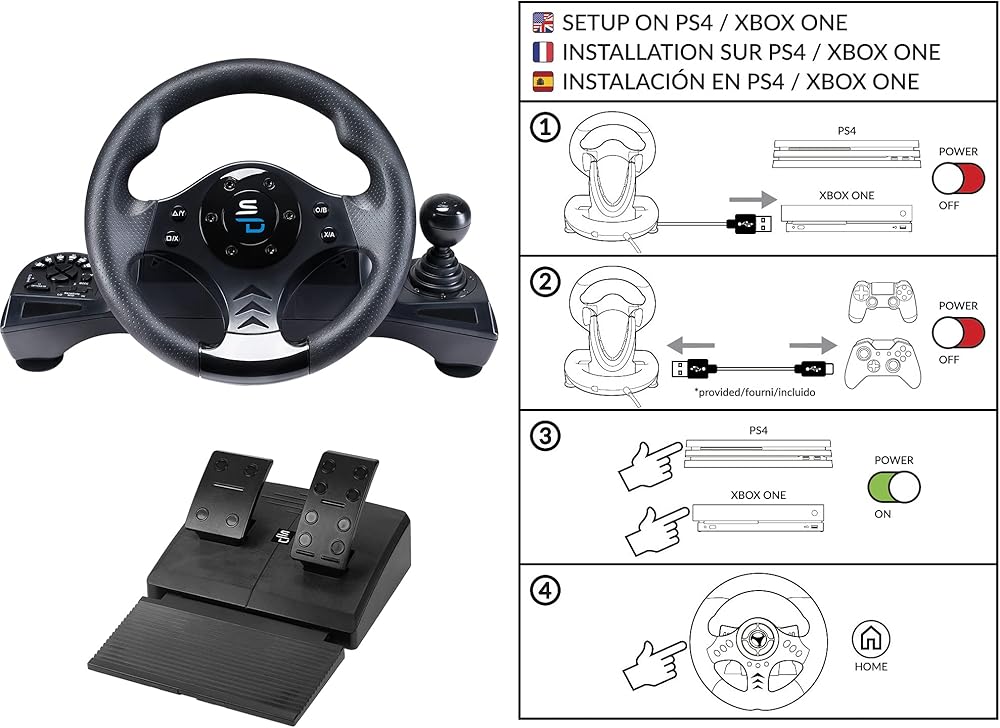 Steering wheel compatible with Xbox Serie X/S, PS4, Xbox One and PC. Dual vibration motor. Shift lever, Pedal board with accelerator and brake pedals. Gear shift paddles +/-. Replaces the joystick completely: menu navigation via the directional cross and the buttons on the steering wheel. 270 rotation angle. Sensitivity adjustment (3 sensitivity levels). Large pedals with footrest system and anti-slip pads for optimum stability. Suction cup attachment system. Connects directly to the joystick. Reprogrammable buttons to adapt to all types of games. 100% compatible with all racing games (Gran Turismo Sport, Forza Motor Sport 7, Project Cars 2, F1 2020, Need for Speed, Dirt, WRC, Grid, V Rally 4, Gear Club 2... and even GTA V etc).