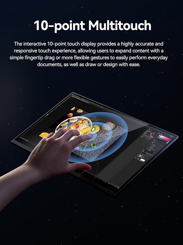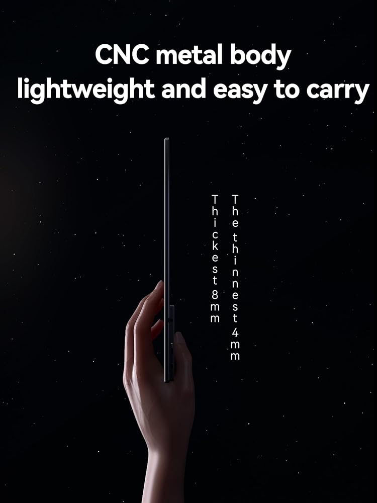 • 💥【عصرية وخفيفة الوزن】مصنوعة من سبائك الألومنيوم CNC، تجمع الشاشة المحمولة MSS-A156 بين الجمال الأنيق والمتانة القوية. وزنها 900 جرام فقط وأبعادها 357*223*4 ملم، ويمكن وضعها بسهولة في الحقيبة لسهولة حملها. إنه الرفيق المثالي لرحلاتك.