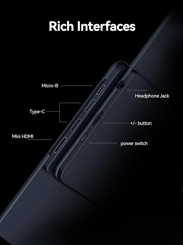 • 🌈[تعزيز الاتصال] قم بتوسيع إمكانياتك من خلال خيارات الاتصال المتنوعة. يمكنك الاتصال بسهولة بمجموعة متنوعة من الأجهزة باستخدام واجهات Mini HDMI وType-C (x2) كاملة المواصفات وMicro USB ومقبس سماعة الرأس. لتعدد المهام بسلاسة. تمكنك شاشة الكمبيوتر المحمولة MSS-A156 من العمل بشكل أسرع، كلما جاءك الإلهام.