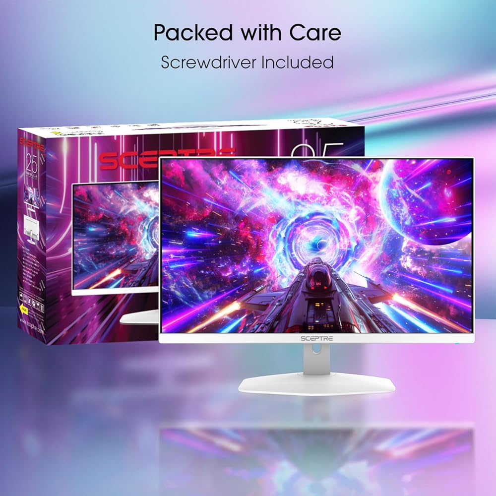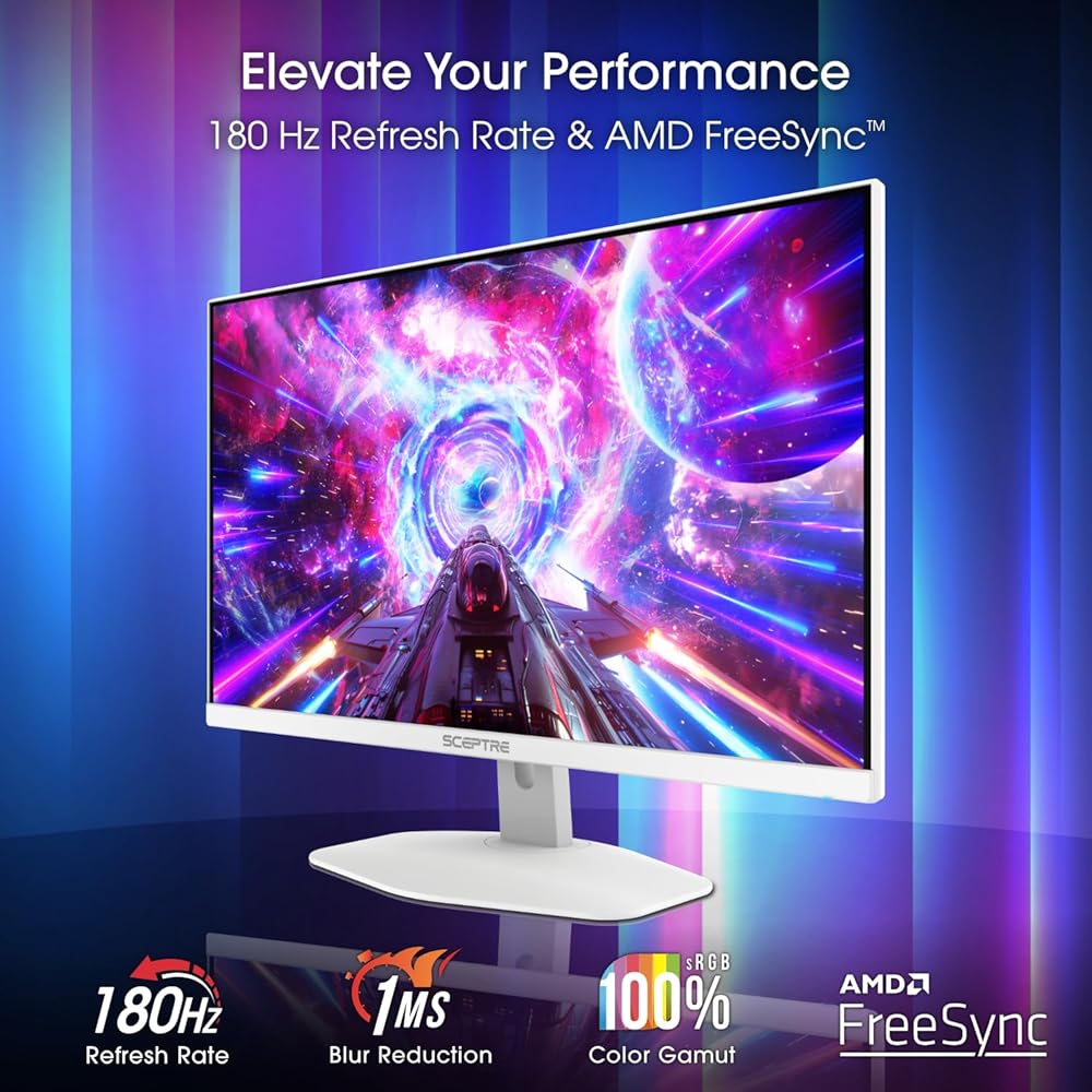 Introducing the Sceptre E255B-FW180TW High Refresh Rate Gaming Monitor – A Monitor with it's performance unleashed! Elevate your gaming experience to new heights with the Sceptre High Refresh Rate Gaming Monitor. Designed for the modern gamer who demands top-tier performance, this cutting-edge monitor delivers a visual feast that goes beyond ordinary displays. Boasting a 25 inch diagonal viewable 1920x1080 display, witness every detail come to life in stunning high definition. Whether you're navigating intense battlegrounds or exploring vast virtual landscapes, the vibrant colors and sharp contrasts will keep you at the edge of your seat. Bid farewell to stuttering and tearing. The E255B features a lightning-fast refresh rate of 180Hz and a swift response time of 1ms BR, ensuring buttery-smooth gameplay without a hint of motion blur. Immerse yourself in the action as this monitor keeps pace with the most demanding gaming scenarios. Get lost in the game with the immersive deep colors of a 100% sRGB rated VA panel. It's not just a monitor; it's a portal to another dimension. Stay ahead of the competition with our built-in AMD FreeSync Premium technology. Experience tear-free gaming with flawless synchronization between the monitor and your graphics card. The E255B ensures that every frame is delivered with precision, giving you the competitive edge you need. Crafted with a sleek and modern aesthetic, the E255B not only performs like a champion but looks the part too. The slim bezels maximize your viewing area, and versatile connectivity options, including 1 x Type-C, 1 x HDMI, and 1 x DP, making it a seamless fit for your gaming setup. Upgrade your gaming rig with the E255B-FW180TW High Refresh Rate Gaming Monitor – where style meets performance, and victory meets pixels. Elevate your gaming experience today!