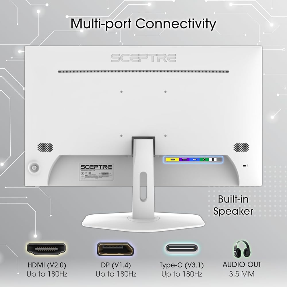 Ports 【SEAMLESS CONNECTIVITY & PERFORMANCE】 Seamlessly link your devices to our one HDMI port, one DisplayPort, and one Type-C port providing up to 180Hz refresh rate, ensuring not only versatile connectivity but also a buttery-smooth visual experience for both work and play. Built-in Speakers and Audio Out Jack also provides diverse audio options.